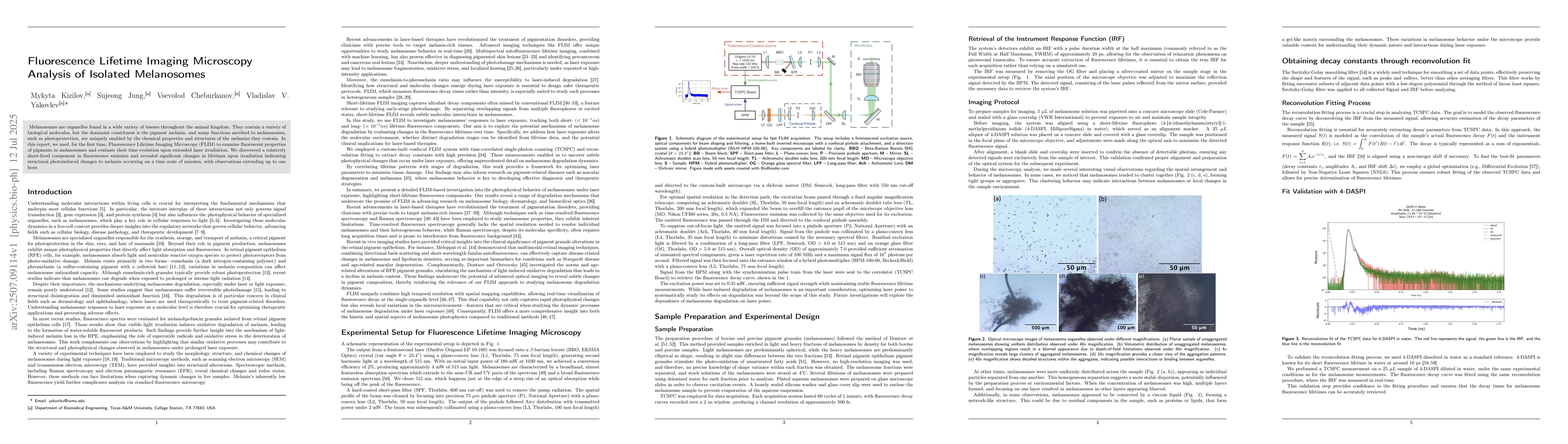 Melanosomes are organelles found in a wide variety of tissues throughout the animal kingdom. They contain a variety of biological molecules, but the dominant constituent is the pigment melanin, and many functions ascribed to melanosomes, such as photoprotection, are uniquely enabled by the chemical properties and structures of the melanins they contain. In this report, we used, for the first time, Fluorescence Lifetime Imaging Microscopy (FLIM) to examine fluorescent properties of pigments in melanosomes and evaluate their time evolution upon extended laser irradiation. We discovered a relatively short-lived component in fluorescence emission and revealed significant changes in lifetimes upon irradiation indicating structural photoinduced changes to melanin occurring on a time scale of minutes, with observations extending up to one hour.