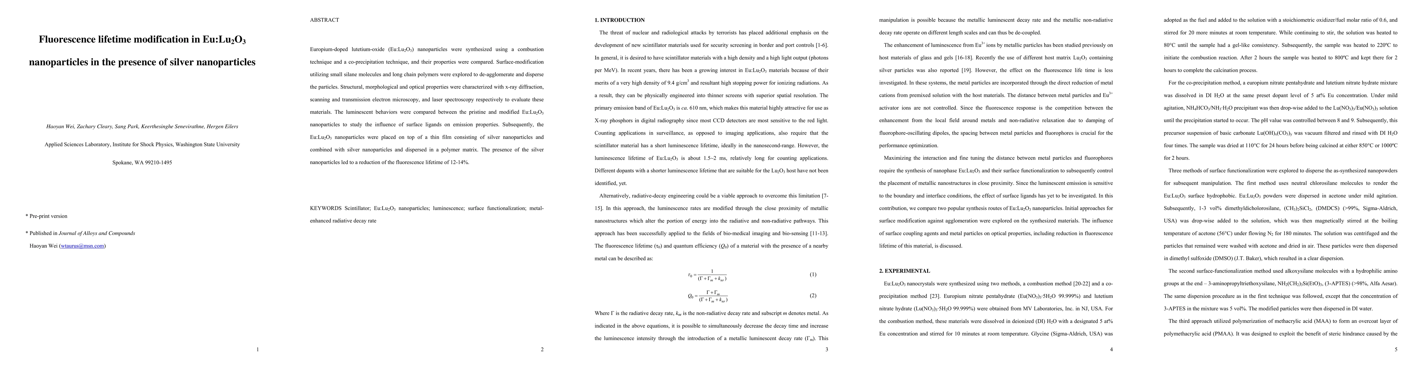 Europium-doped lutetium-oxide (Eu:Lu2O3) nanoparticles were synthesized using a combustion technique and a co-precipitation technique, and their properties were compared. Surface-modification utilizing small silane molecules and long chain polymers were explored to de-agglomerate and disperse the particles. Structural, morphological and optical properties were characterized with x-ray diffraction, scanning and transmission electron microscopy, and laser spectroscopy respectively to evaluate these materials. The luminescent behaviors were compared between the pristine and modified Eu:Lu2O3 nanoparticles to study the influence of surface ligands on emission properties. Subsequently, the Eu:Lu2O3 nanoparticles were placed on top of a thin film consisting of silver nanoparticles and combined with silver nanoparticles and dispersed in a polymer matrix. The presence of the silver nanoparticles led to a reduction of the fluorescence lifetime of 12-14%.