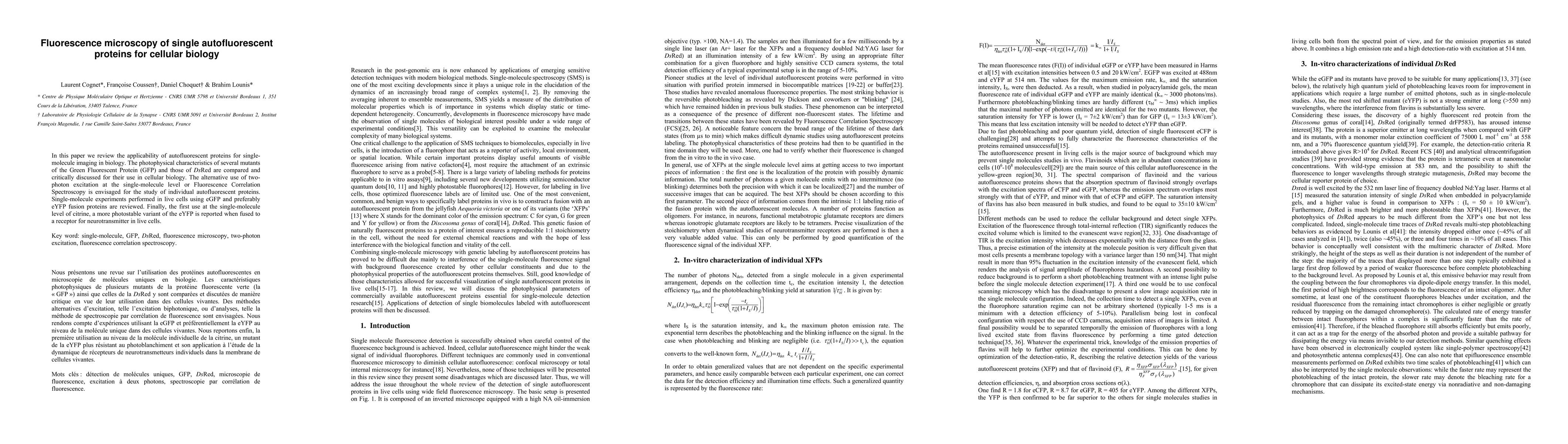 This paper reviews the use of autofluorescent proteins like GFP and DsRed mutants for single-molecule imaging in cellular biology, comparing their photophysical properties. It also explores the potential of two-photon excitation and Fluorescence Correlation Spectroscopy for studying individual autofluorescent proteins in live cells, highlighting the first use of the more photostable citrine variant fused to a receptor protein.
