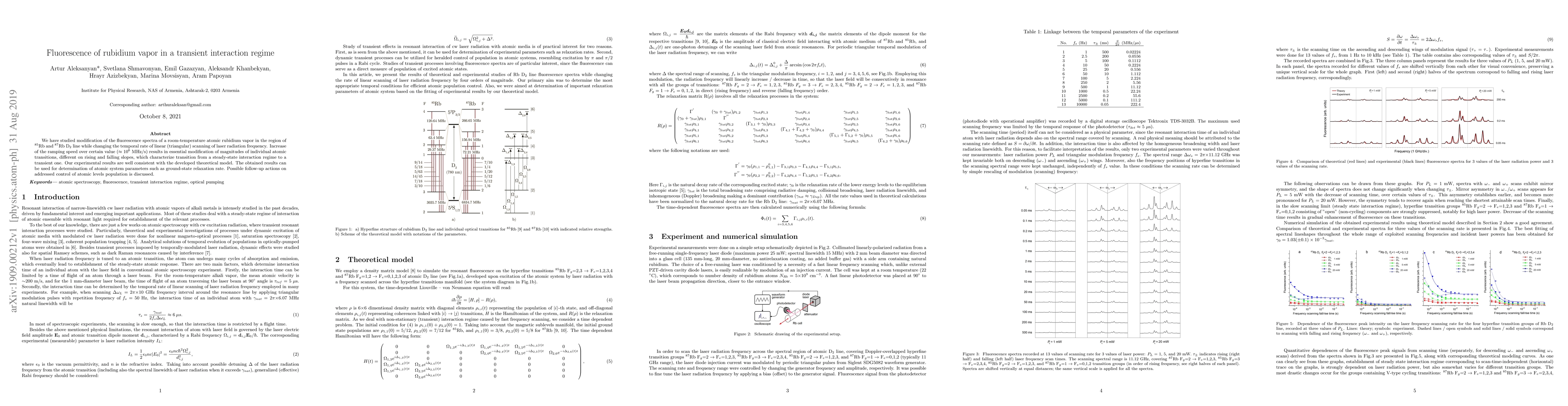 We have studied modification of the fluorescence spectra of a room-temperature atomic rubidium vapor in the region of $^{85}$Rb and $^{87}$Rb D$_2$ line while changing the temporal rate of linear (triangular) scanning of laser radiation frequency. Increase of the ramping speed over certain value ($\approx$ 10$^6$ MHz/s) results in essential modification of magnitudes of individual atomic transitions, different on rising and falling slopes, which characterize transition from a steady-state interaction regime to a transient one. Our experimental results are well consistent with the developed theoretical model. The obtained results can be used for determination of atomic system parameters such as ground-state relaxation rate. Possible follow-up actions on addressed control of atomic levels population is discussed.