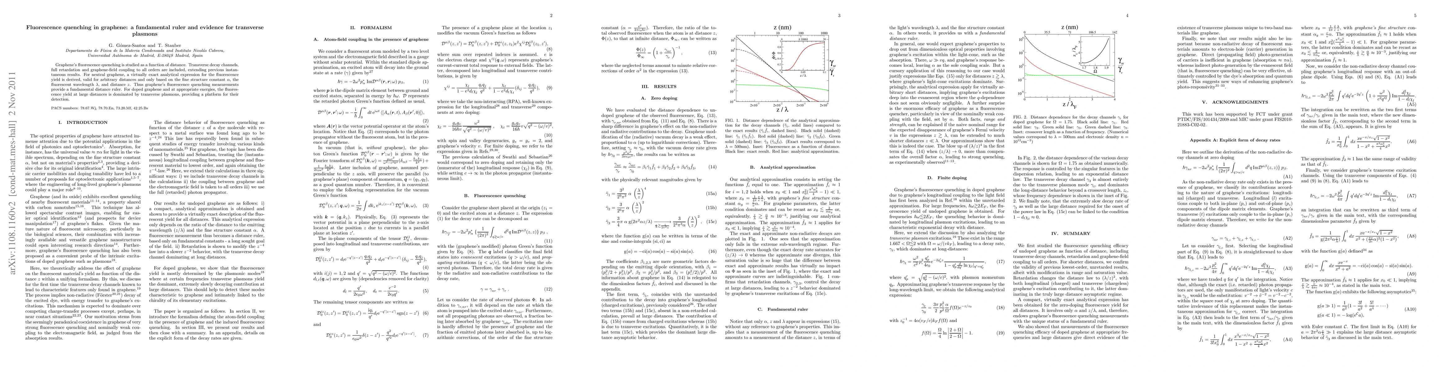 This paper derives an analytical expression for graphene's fluorescence quenching, revealing it as a fundamental distance ruler based on the fine structure constant, wavelength, and distance. It also shows that transverse plasmons dominate the fluorescence yield in doped graphene, offering a method for their detection.
