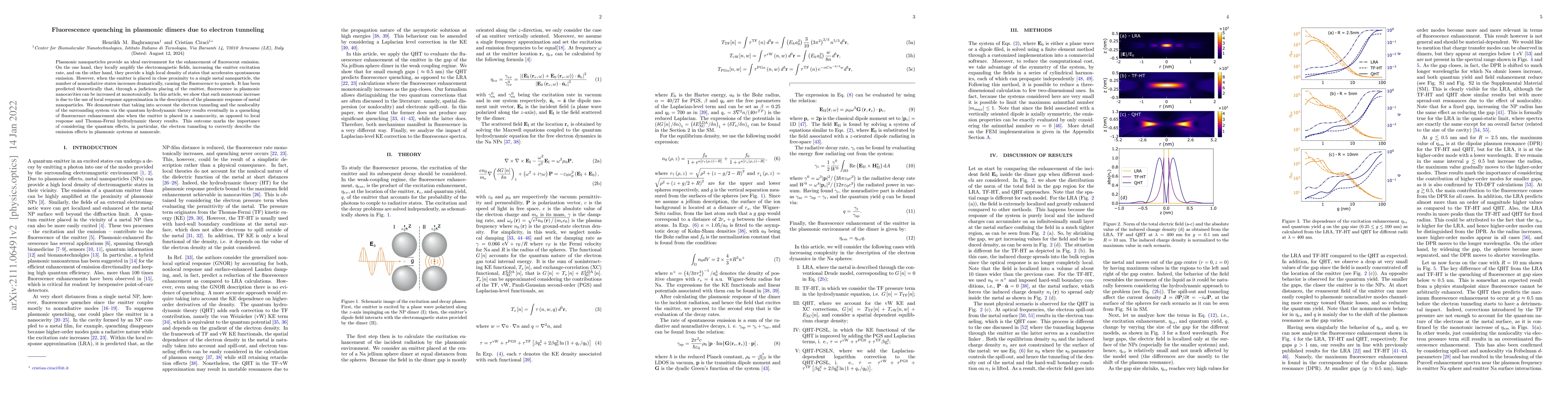 This paper investigates fluorescence quenching in plasmonic dimers, revealing that electron tunneling and nonlocality, described by quantum hydrodynamic theory, can lead to quenching even when emitters are placed in plasmonic nanocavities. It emphasizes the importance of quantum effects, particularly electron tunneling, for accurately describing emission in nanoscale plasmonic systems.