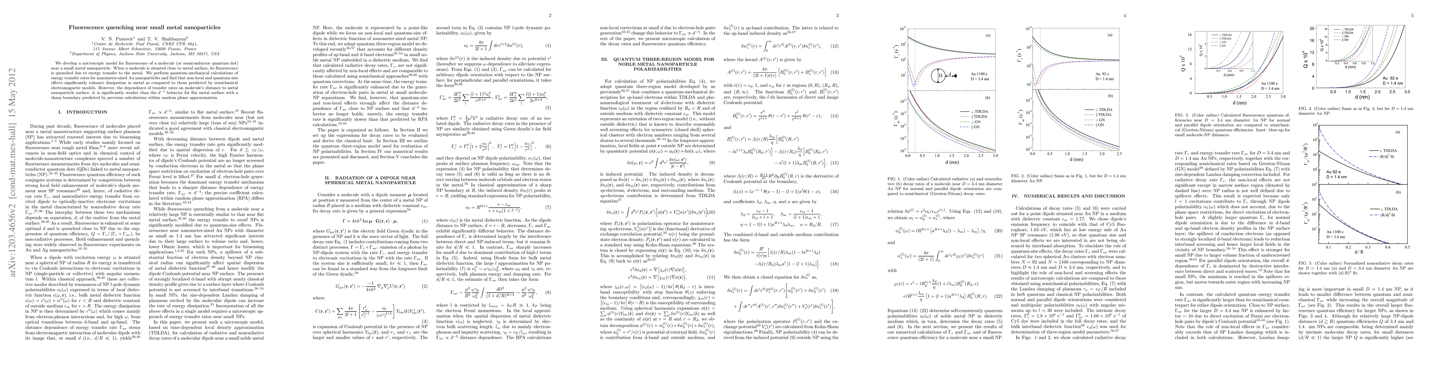 This paper develops a microscopic model to study fluorescence quenching of molecules near small metal nanoparticles, revealing that quantum-size effects significantly enhance energy dissipation compared to semiclassical models. The study finds that the distance dependence of energy transfer rates is weaker than previously predicted.