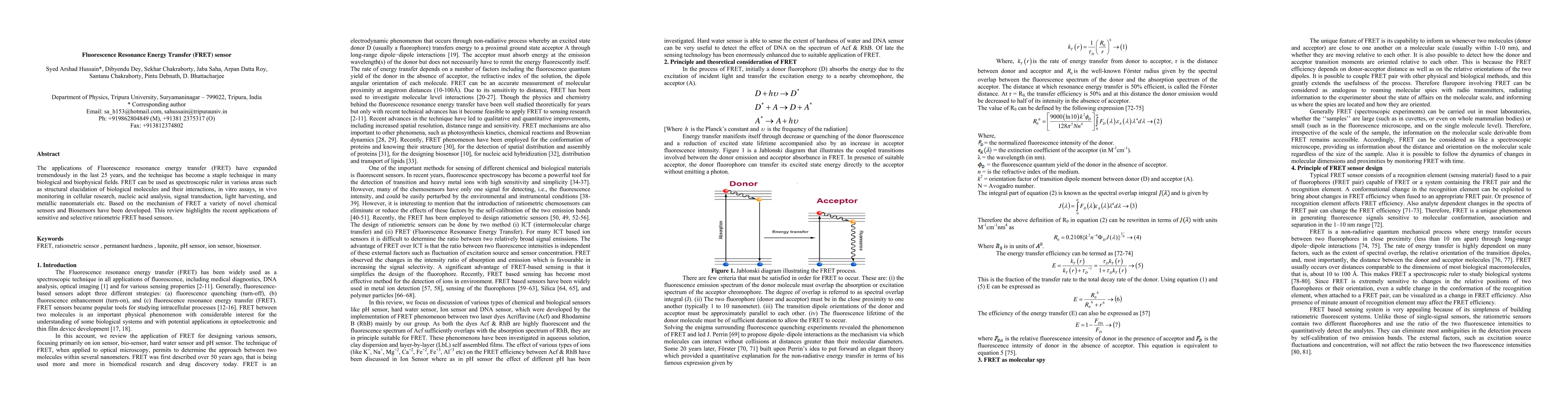 The applications of Fluorescence resonance energy transfer (FRET) have expanded tremendously in the last 25 years, and the technique has become a staple technique in many biological and biophysical fields. FRET can be used as spectroscopic ruler in various areas such as structural elucidation of biological molecules and their interactions, in vitro assays, in vivo monitoring in cellular research, nucleic acid analysis, signal transduction, light harvesting, and metallic nanomaterials etc. Based on the mechanism of FRET a variety of novel chemical sensors and Biosensors have been developed. This review highlights the recent applications of sensitive and selective ratiometric FRET based sensors.