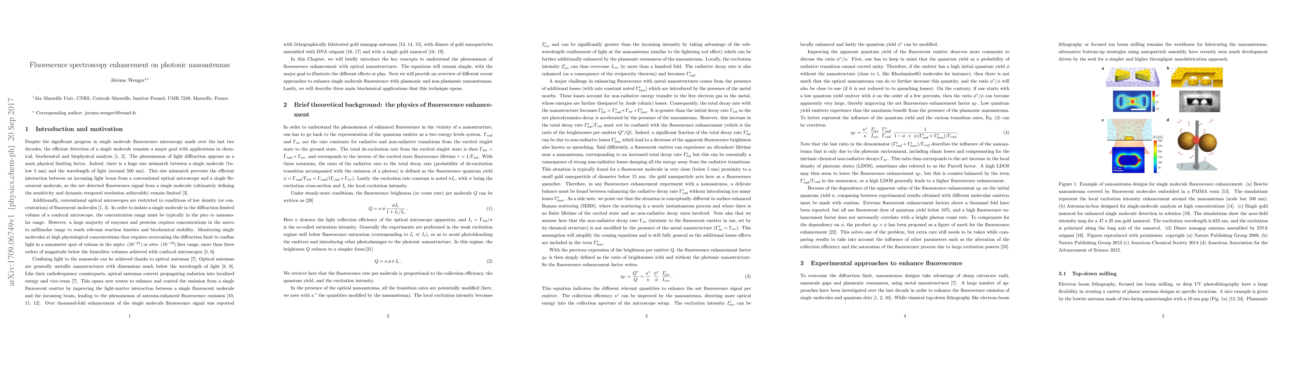 This document briefly introduces the key concepts to understand the phenomenon of fluorescence enhancement with optical nanostructures. The equations remain simple, with the major goal to illustrate the different physical effects at play. It also provides an overview of different recent approaches to enhance single molecule fluorescence with plasmonic and non-plasmonic nanoantennas, and describes three main biochemical applications.