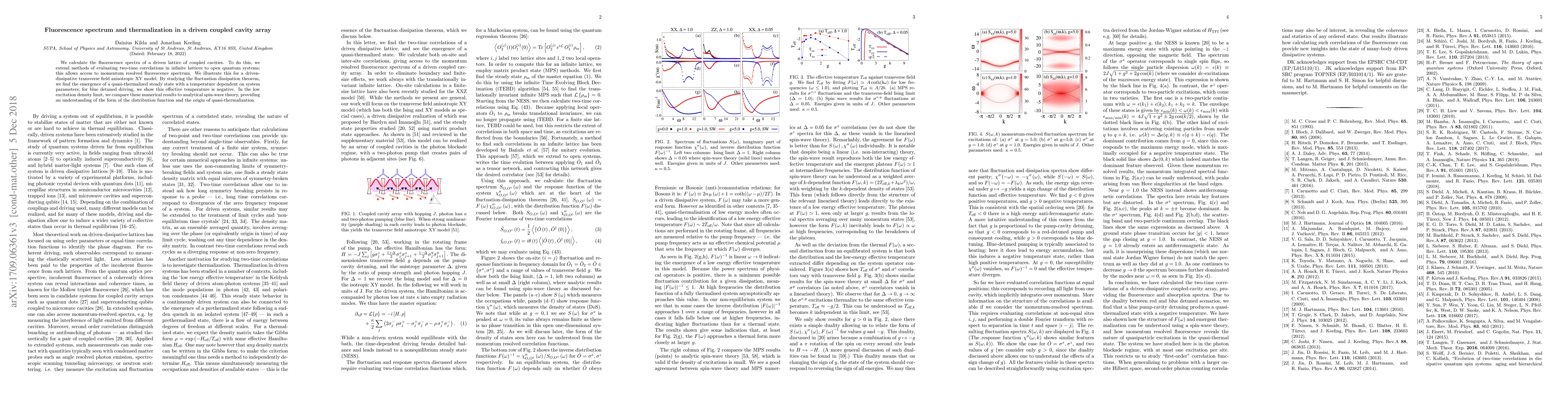 We calculate the fluorescence spectra of a driven lattice of coupled cavities. To do this, we extend methods of evaluating two-time correlations in infinite lattices to open quantum systems; this allows access to momentum resolved fluorescence spectrum. We illustrate this for a driven-dissipative transverse field anisotropic XY model. By studying the fluctuation dissipation theorem, we find the emergence of a quasi-thermalized steady state with a temperature dependent on system parameters; for blue detuned driving, we show this effective temperature is negative. In the low excitation density limit, we compare these numerical results to analytical spin-wave theory, providing an understanding of the form of the distribution function and the origin of quasi-thermalization.