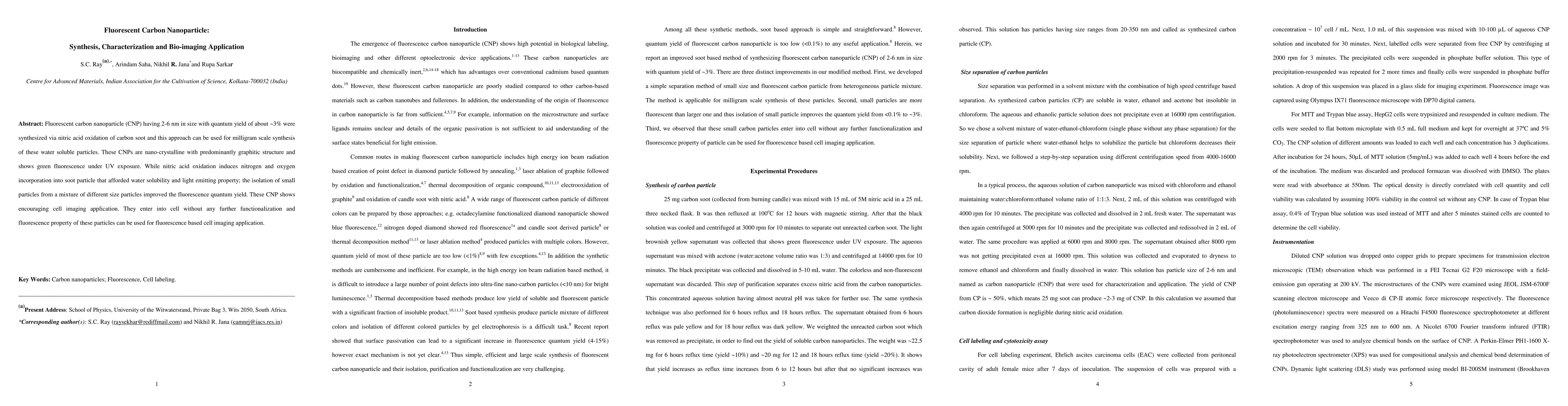 Fluorescent carbon nanoparticle (CNP) having 2-6 nm in size with quantum yield of about ~3% were synthesized via nitric acid oxidation of carbon soot and this approach can be used for milligram scale synthesis of these water soluble particles. These CNPs are nano-crystalline with predominantly graphitic structure and shows green fluorescence under UV exposure. While nitric acid oxidation induces nitrogen and oxygen incorporation into soot particle that afforded water solubility and light emitting property; the isolation of small particles from a mixture of different size particles improved the fluorescence quantum yield. These CNP shows encouraging cell imaging application. They enter into cell without any further functionalization and fluorescence property of these particles can be used for fluorescence based cell imaging application.