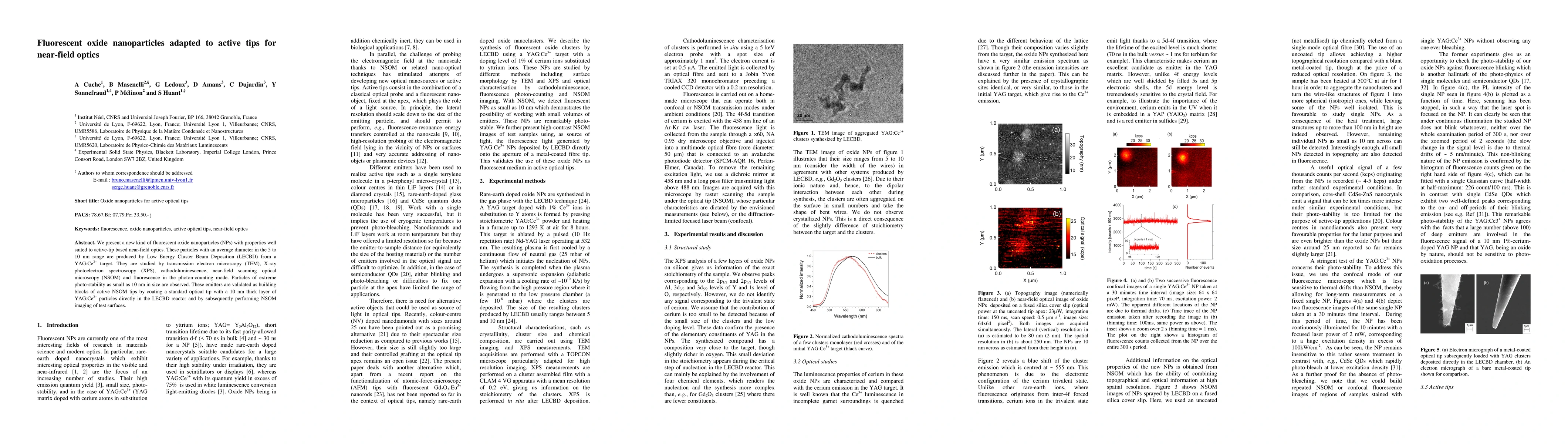 We present a new kind of fluorescent oxide nanoparticles with properties well suited to active-tip based near-field optics. These particles with an average diameter in the range 5-10 nm are produced by Low Energy Cluster Beam Deposition (LECBD) from a YAG:Ce3+ target. They are studied by transmission electron microscopy (TEM), X-ray photoelectron spectroscopy (XPS), classical photoluminescence, cathodoluminescence and near-field scanning optical microscopy (NSOM). Particles of extreme photo-stability as small as 10 nm in size are observed. These emitters are validated as building blocks of active NSOM tips by coating a standard optical tip with a 10 nm thick layer of YAG:Ce3+ particles directly in the LECBD reactor and by subsequently performing NSOM imaging of test surfaces.