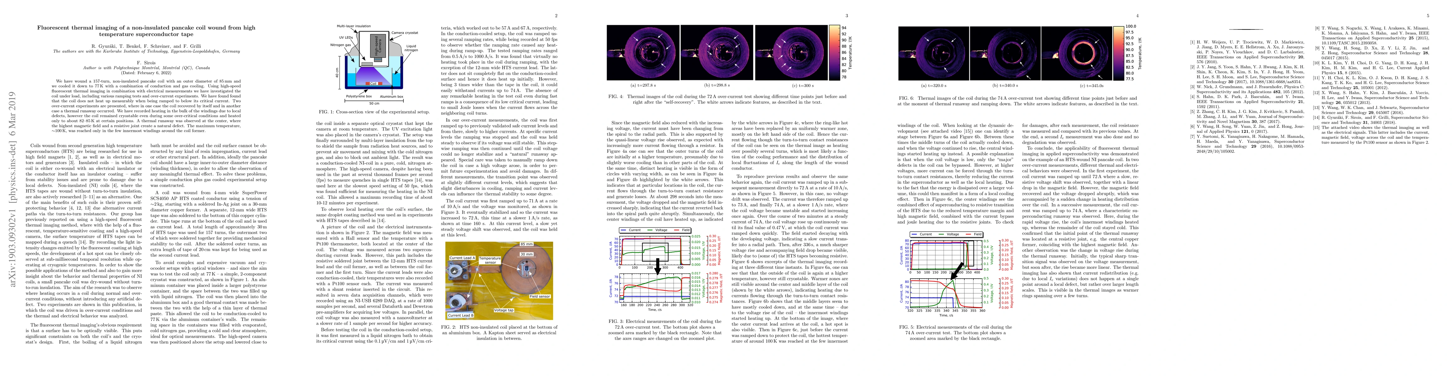 This study investigates a non-insulated pancake coil wound from high-temperature superconductor tape, cooled to 77 K, and examined using fluorescent thermal imaging. The coil remained cryostable under normal conditions but experienced localized heating and thermal runaway due to defects, particularly at the center where the highest magnetic field and resistive joints were present.