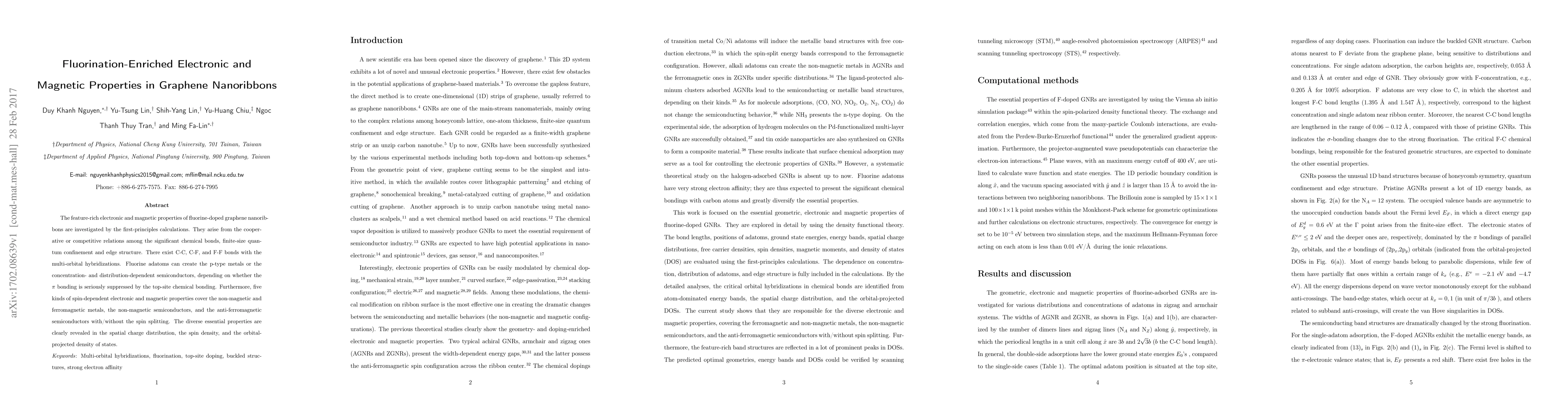 The feature-rich electronic and magnetic properties of fluorine-doped graphene nanoribbons are investigated by the first-principles calculations. They arise from the cooperative or competitive relations among the significant chemical bonds, finite-size quantum confinement and edge structure. There exist C-C, C-F, and F-F bonds with the multi-orbital hybridizations. Fluorine adatoms can create the p-type metals or the concentration- and distribution-dependent semiconductors, depending on whether the $\pi$ bonding is seriously suppressed by the top-site chemical bonding. Furthermore, five kinds of spin-dependent electronic and magnetic properties cover the non-magnetic and ferromagnetic metals, the non-magnetic semiconductors, and the anti-ferromagnetic semiconductors with/without the spin splitting. The diverse essential properties are clearly revealed in the spatial charge distribution, the spin density, and the orbital-projected density of states.