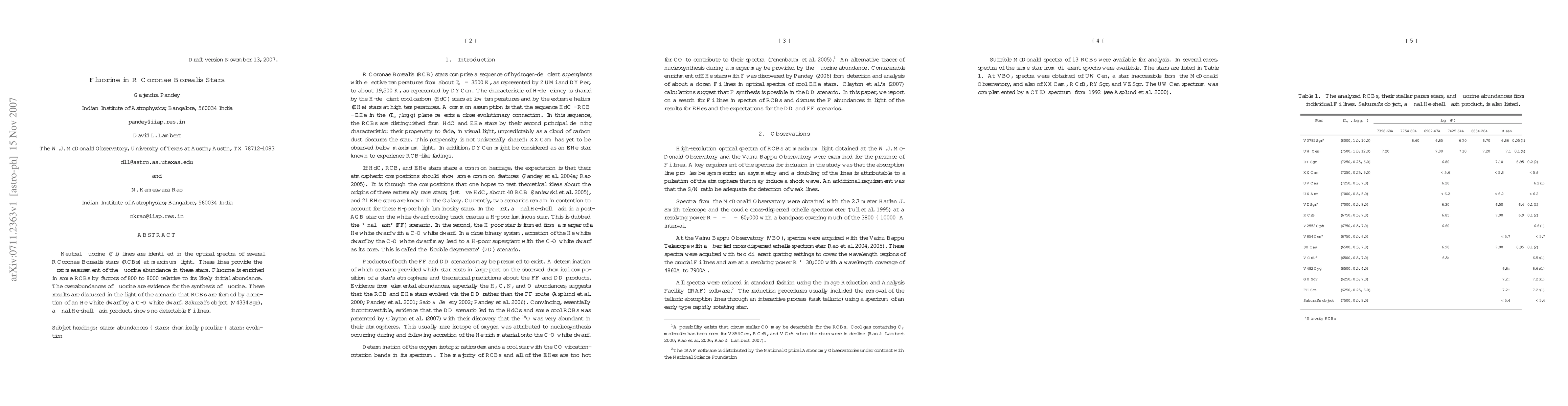 This study identifies neutral fluorine lines in the optical spectra of R Coronae Borealis stars, revealing significant fluorine enrichment by factors of 800 to 8000, suggesting fluorine synthesis. This supports the hypothesis that RCBs form via the accretion of an He white dwarf onto a C-O white dwarf, while Sakurai's object shows no detectable fluorine.