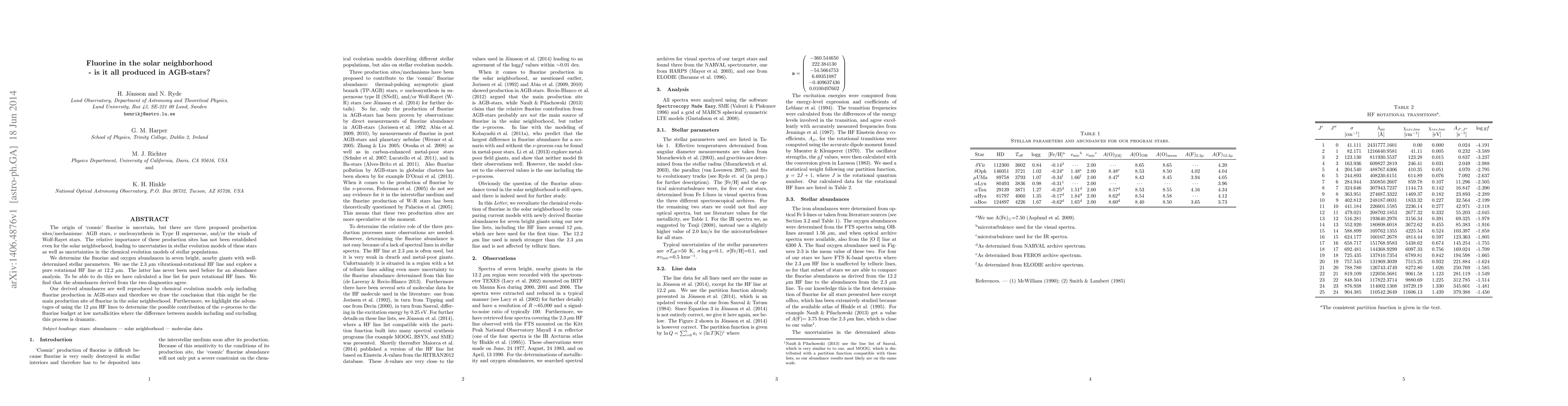 This paper investigates the origin of fluorine in the solar neighborhood, finding that fluorine abundances in nearby giants are best explained by production in asymptotic giant branch (AGB) stars. The study also introduces the use of previously unused 12 μm HF lines for abundance analysis, suggesting this method could help determine the contribution of the ν-process in low-metallicity environments.