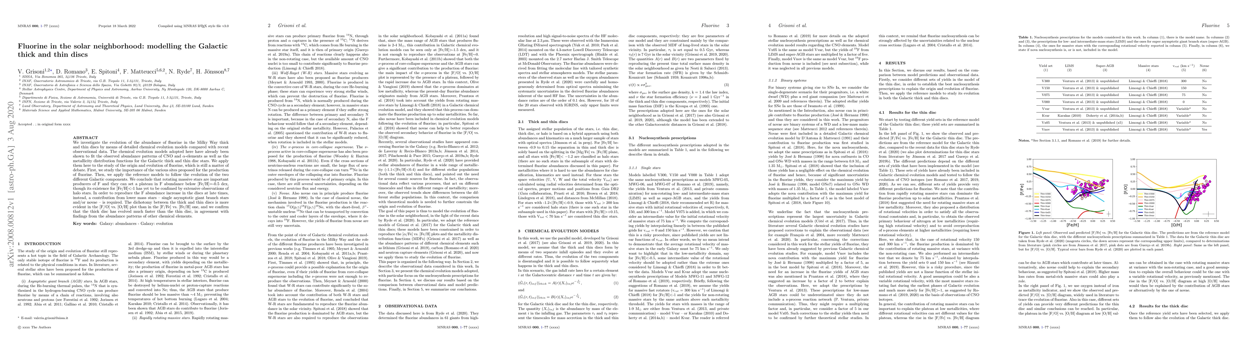 This paper investigates the evolution of fluorine abundance in the Milky Way's thick and thin discs using detailed chemical evolution models, finding that rotating massive stars are significant fluorine producers, while lower mass stars like asymptotic giant branch stars and novae contribute to the late-time abundance increase. The study highlights a faster evolution of the thick disc compared to the thin disc.