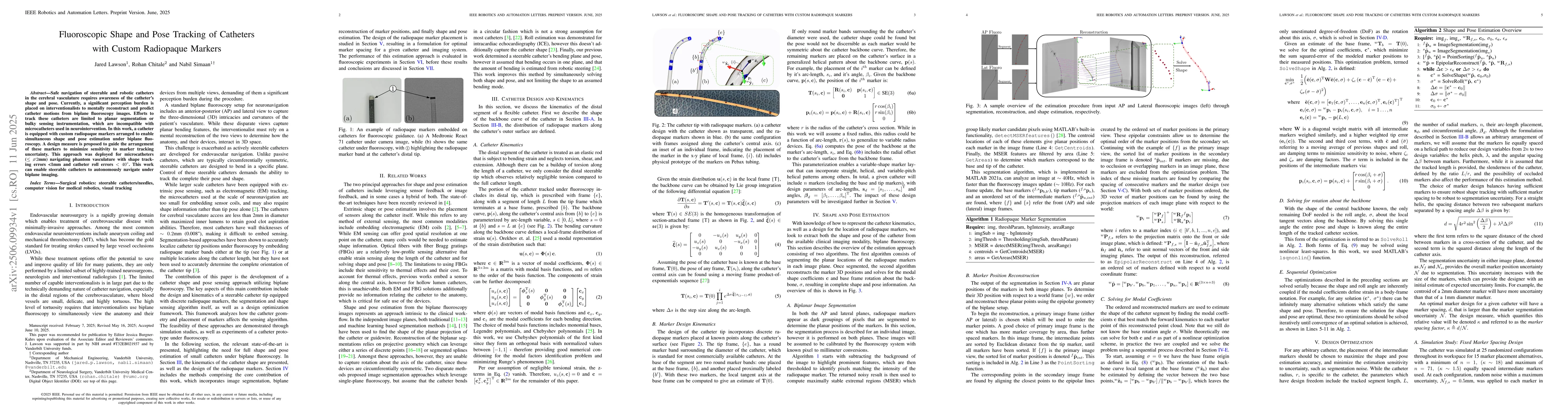 Safe navigation of steerable and robotic catheters in the cerebral vasculature requires awareness of the catheters shape and pose. Currently, a significant perception burden is placed on interventionalists to mentally reconstruct and predict catheter motions from biplane fluoroscopy images. Efforts to track these catheters are limited to planar segmentation or bulky sensing instrumentation, which are incompatible with microcatheters used in neurointervention. In this work, a catheter is equipped with custom radiopaque markers arranged to enable simultaneous shape and pose estimation under biplane fluoroscopy. A design measure is proposed to guide the arrangement of these markers to minimize sensitivity to marker tracking uncertainty. This approach was deployed for microcatheters smaller than 2mm OD navigating phantom vasculature with shape tracking errors less than 1mm and catheter roll errors below 40 degrees. This work can enable steerable catheters to autonomously navigate under biplane imaging.
