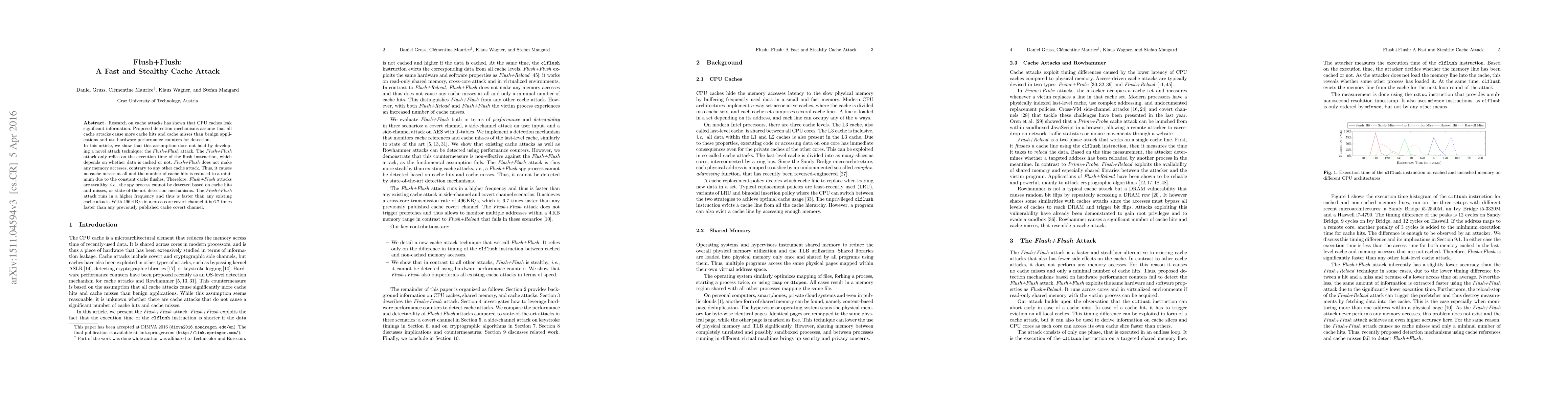 Research on cache attacks has shown that CPU caches leak significant information. Proposed detection mechanisms assume that all cache attacks cause more cache hits and cache misses than benign applications and use hardware performance counters for detection. In this article, we show that this assumption does not hold by developing a novel attack technique: the Flush+Flush attack. The Flush+Flush attack only relies on the execution time of the flush instruction, which depends on whether data is cached or not. Flush+Flush does not make any memory accesses, contrary to any other cache attack. Thus, it causes no cache misses at all and the number of cache hits is reduced to a minimum due to the constant cache flushes. Therefore, Flush+Flush attacks are stealthy, i.e., the spy process cannot be detected based on cache hits and misses, or state-of-the-art detection mechanisms. The Flush+Flush attack runs in a higher frequency and thus is faster than any existing cache attack. With 496 KB/s in a cross-core covert channel it is 6.7 times faster than any previously published cache covert channel.