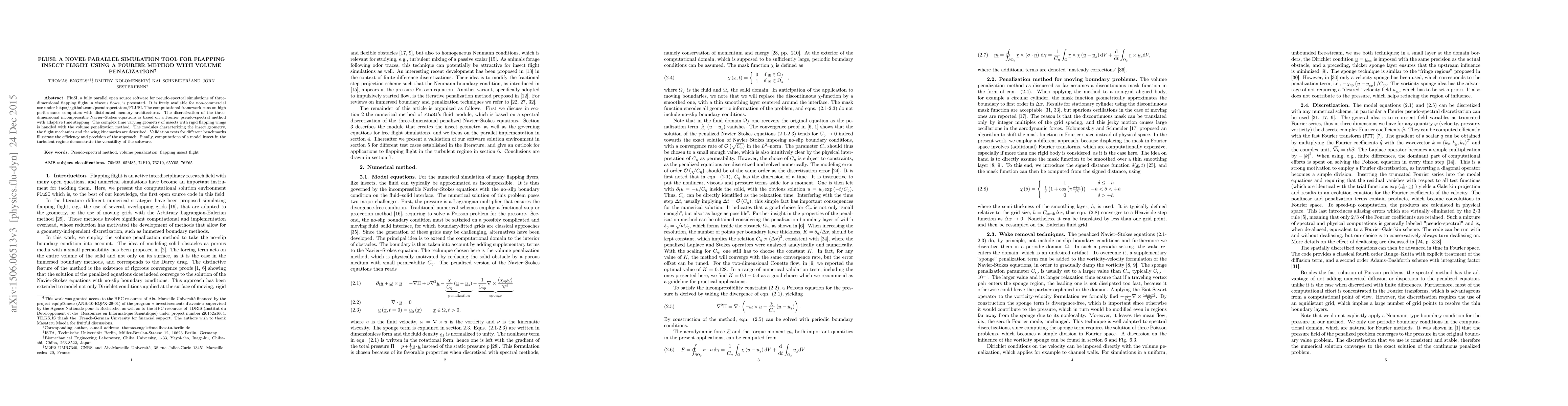 FluSI is a parallel simulation tool for modeling three-dimensional flapping insect flight using a Fourier pseudo-spectral method and volume penalization. It efficiently handles complex wing geometries and is validated through various benchmarks, showcasing its precision and versatility in turbulent flow simulations.