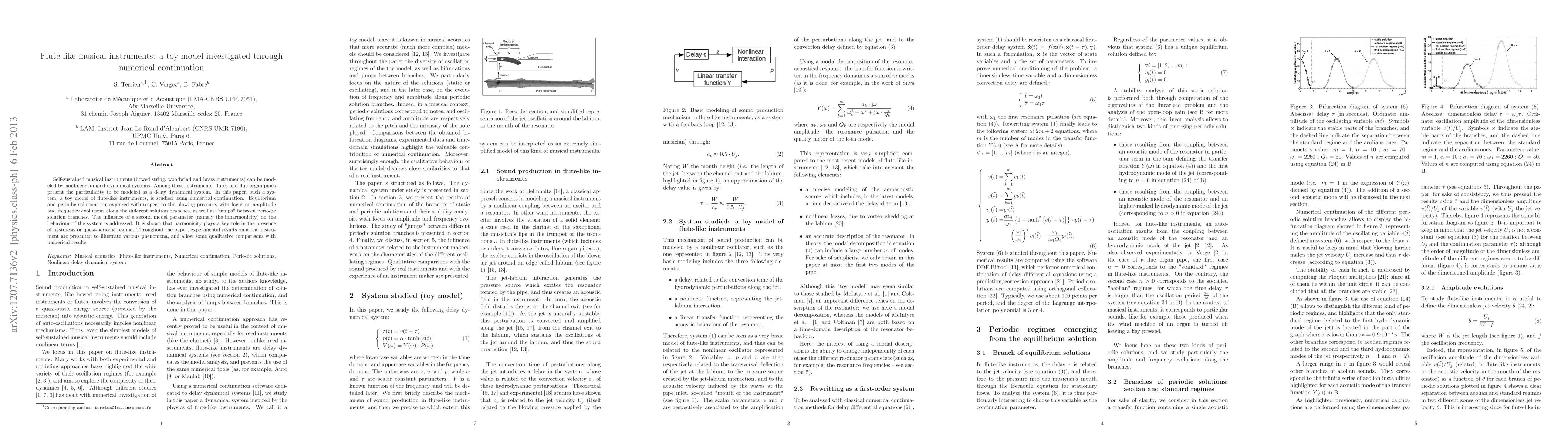 This paper investigates a toy model of flute-like musical instruments using numerical continuation to explore equilibrium and periodic solutions under varying blowing pressure. It highlights the role of inharmonicity in system behavior, demonstrating the presence of hysteresis and quasi-periodic regimes, and compares numerical findings with experimental results from a real instrument.