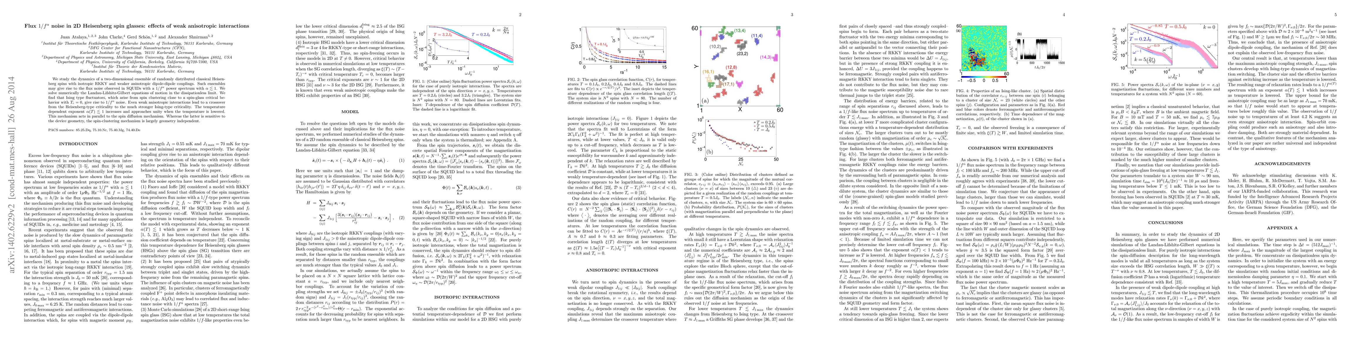We study the dynamics of a two-dimensional ensemble of randomly distributed classical Heisenberg spins with isotropic RKKY and weaker anisotropic dipole-dipole couplings. Such ensembles may give rise to the flux noise observed in SQUIDs with a $1/f^{\alpha}$ power spectrum ($\alpha \lesssim 1$). We solve numerically the Landau-Lifshiftz-Gilbert equations of motion in the dissipationless limit. We find that Ising type fluctuators, which arise from spin clustering close to a spin-glass critical behavior with $T_c =0$, give rise to $1/f^{\alpha}$ noise. Even weak anisotropic interactions lead to a crossover from the Heisenberg-type criticality to the much stronger Ising-type criticality. The temperature dependent exponent $\alpha(T) \lesssim 1$ grows and approaches unity when the temperature is lowered. This mechanism acts in parallel to the spin diffusion mechanism. Whereas the latter is sensitive to the device geometry, the spin-clustering mechanism is largely geometry independent.