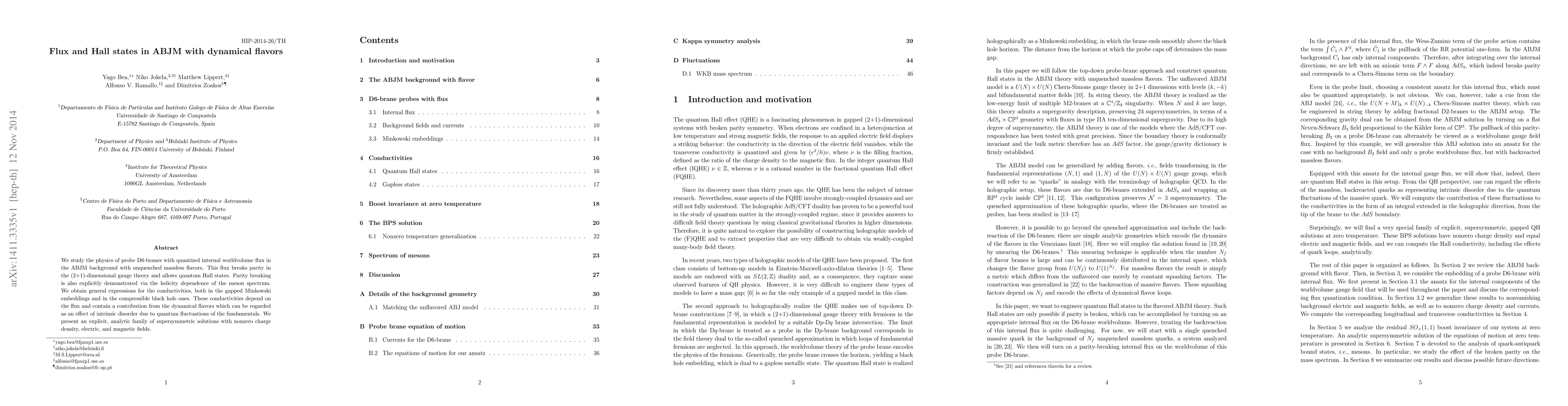 We study the physics of probe D6-branes with quantized internal worldvolume flux in the ABJM background with unquenched massless flavors. This flux breaks parity in the (2+1)-dimensional gauge theory and allows quantum Hall states. Parity breaking is also explicitly demonstrated via the helicity dependence of the meson spectrum. We obtain general expressions for the conductivities, both in the gapped Minkowski embeddings and in the compressible black hole ones. These conductivities depend on the flux and contain a contribution from the dynamical flavors which can be regarded as an effect of intrinsic disorder due to quantum fluctuations of the fundamentals. We present an explicit, analytic family of supersymmetric solutions with nonzero charge density, electric, and magnetic fields.