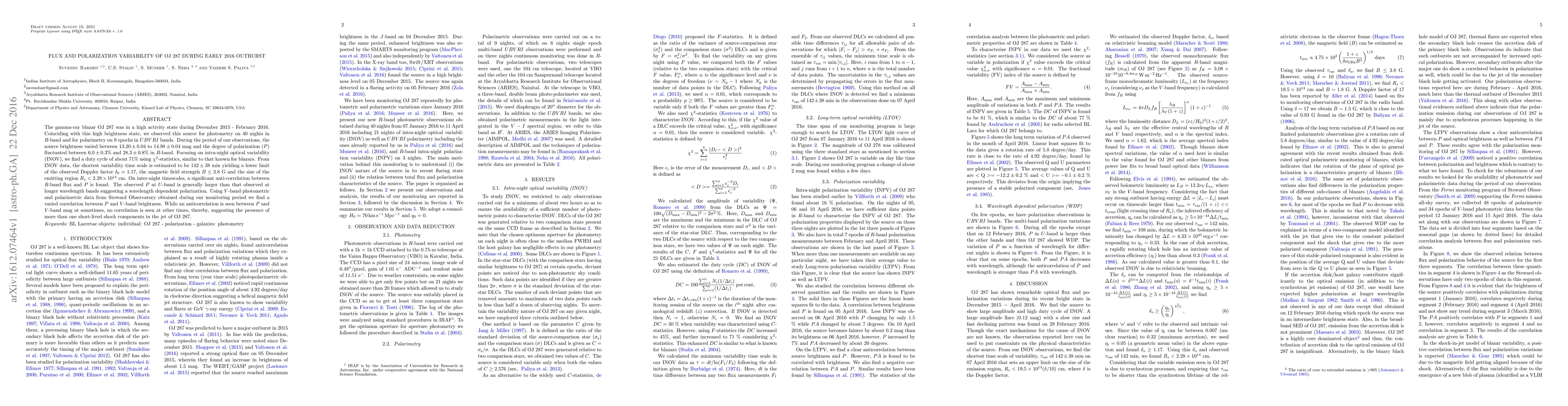 The OJ 287 gamma-ray blazar exhibited significant variability in brightness and polarization during a high activity state in early 2016, with some features suggesting the presence of multiple shock components in its jet.