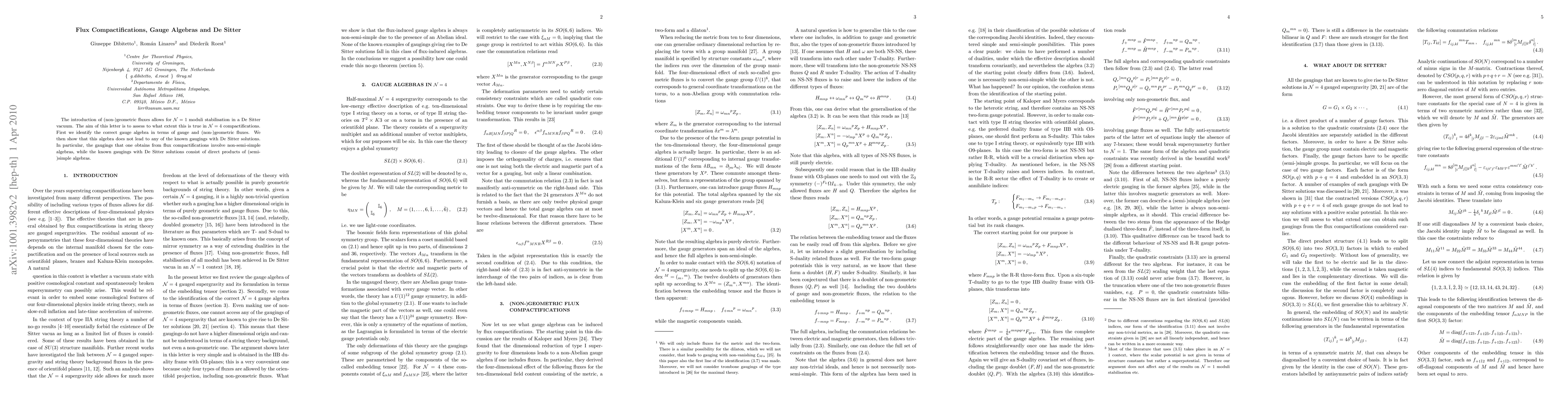 This paper investigates the stabilization of N=1 moduli in N=4 flux compactifications, finding that the gauge algebra derived from gauge and non-geometric fluxes does not align with known gaugings that yield De Sitter solutions, which involve semi-simple algebras.