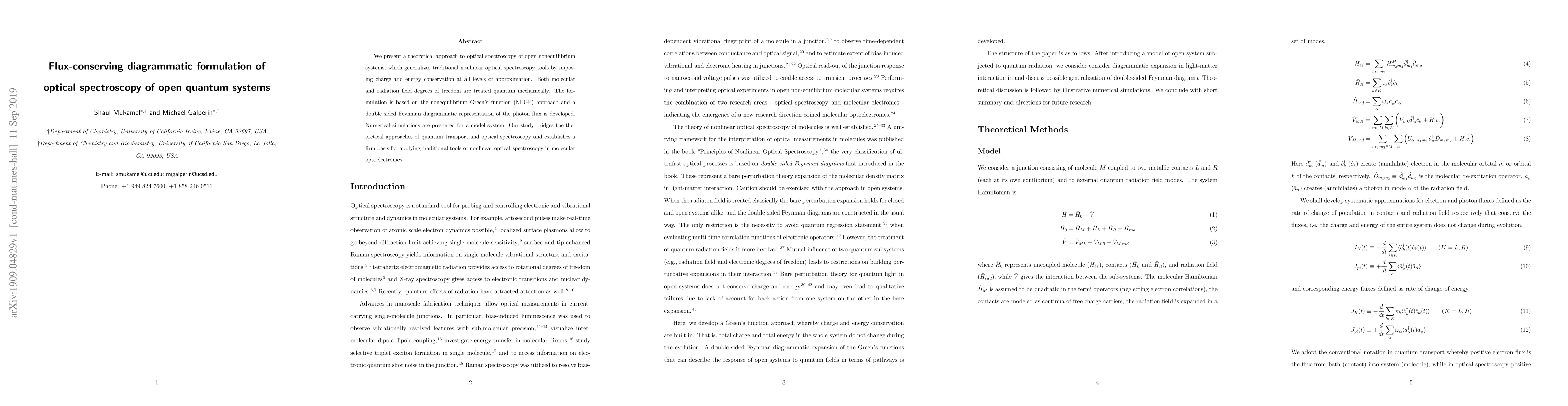 This paper introduces a flux-conserving diagrammatic method for optical spectroscopy of open quantum systems, combining nonequilibrium Green's function theory with a Feynman diagrammatic representation of photon flux. It aims to generalize traditional nonlinear optical spectroscopy by ensuring charge and energy conservation, and provides numerical simulations for a model system.