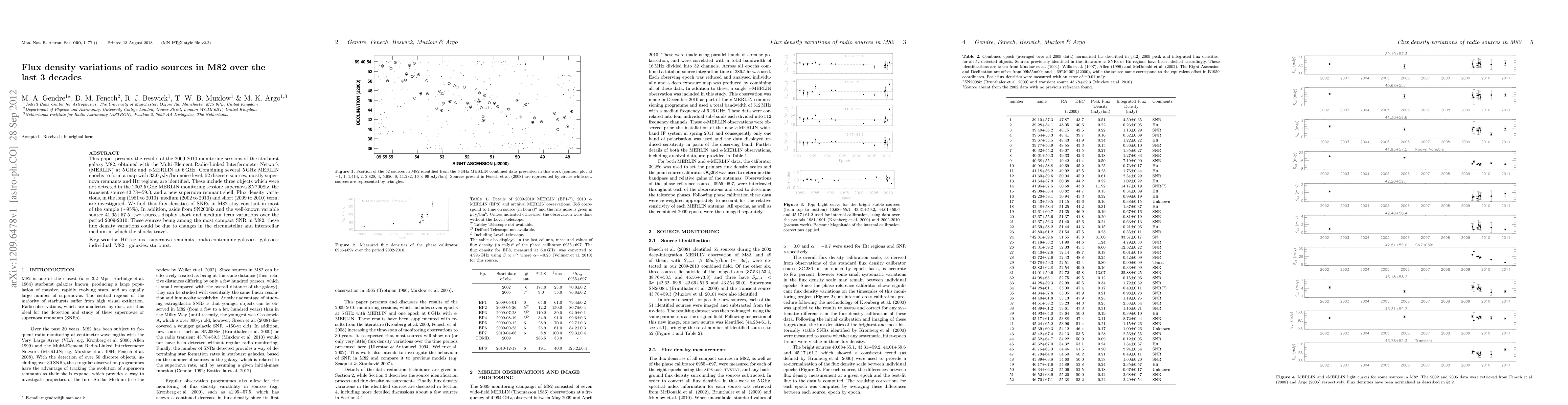 This paper presents the results of the 2009-2010 monitoring sessions of the starburst galaxy M82, obtained with the Multi-Element Radio-Linked Interferometer Network (MERLIN) at 5GHz and e-MERLIN at 6GHz. Combining several 5GHz MERLIN epochs to form a map with 33.0 uJy/bm noise level, 52 discrete sources, mostly supernova remnants and HII regions, are identified. These include three objects which were not detected in the 2002 5GHz MERLIN monitoring session: supernova SN2008iz, the transient source 43.78+59.3, and a new supernova remnant shell. Flux density variations, in the long (1981 to 2010), medium (2002 to 2010) and short (2009 to 2010) term, are investigated. We find that flux densities of SNRs in M82 stay constant in most of the sample (~95%). In addition, aside from SN2008iz and the well-known variable source 41.95+57.5, two sources display short and medium term variations over the period 2009-2010. These sources being among the most compact SNR in M82, these flux density variations could be due to changes in the circumstellar and interstellar medium in which the shocks travel.