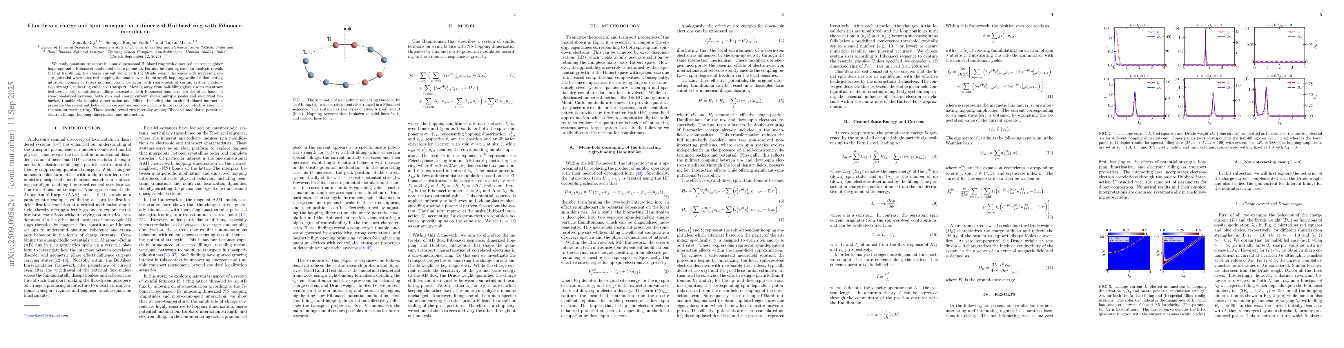 We study quantum transport in a one-dimensional Hubbard ring with dimerized nearest-neighbor hoppings and a Fibonacci-modulated onsite potential. For non-interacting case our analysis reveals that at half-filling, the charge current along with the Drude weight decreases with increasing onsite potential when inter-cell hopping dominates over the intra-cell hopping, while for dominating intra-cell hopping it shows non-monotonic behavior with sharp peak at certain critical modulation strength, indicating enhanced transport. Moving away from half-filling gives rise to re-entrant features in both quantities at fillings associated with Fibonacci numbers. On the other hand, in spin-imbalanced systems, both spin and charge current shows multiple peaks and re-entrant behavior, tunable via hopping dimerization and filling. Including the on-site Hubbard interaction preserves the re-entrant behavior in current and moreover favors finite transport which is absent in the non-interacting ring. These results reveal rich interplay among Fibonacci modulated potential, electron fillings, hopping dimerization and interaction.