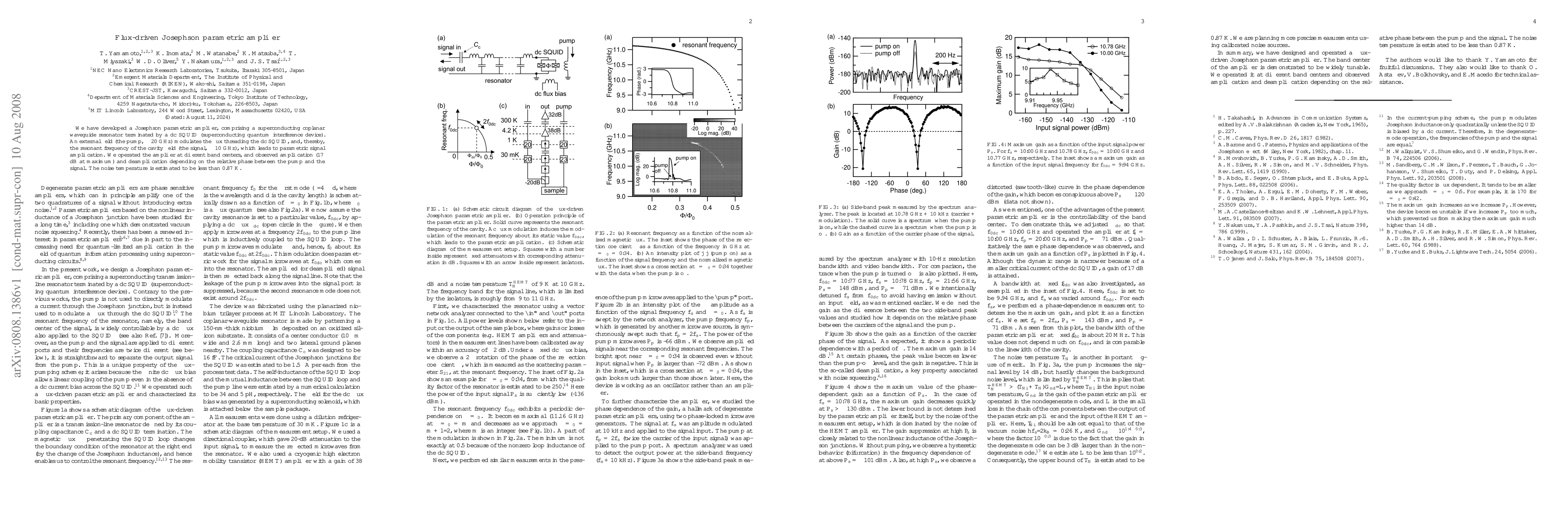 This paper details the development of a flux-driven Josephson parametric amplifier using a superconducting coplanar waveguide resonator and a dc SQUID. The device achieves parametric amplification by modulating the flux through the SQUID with an external pump field, resulting in signal amplification up to 17 dB and varying noise temperature below 0.87 K.