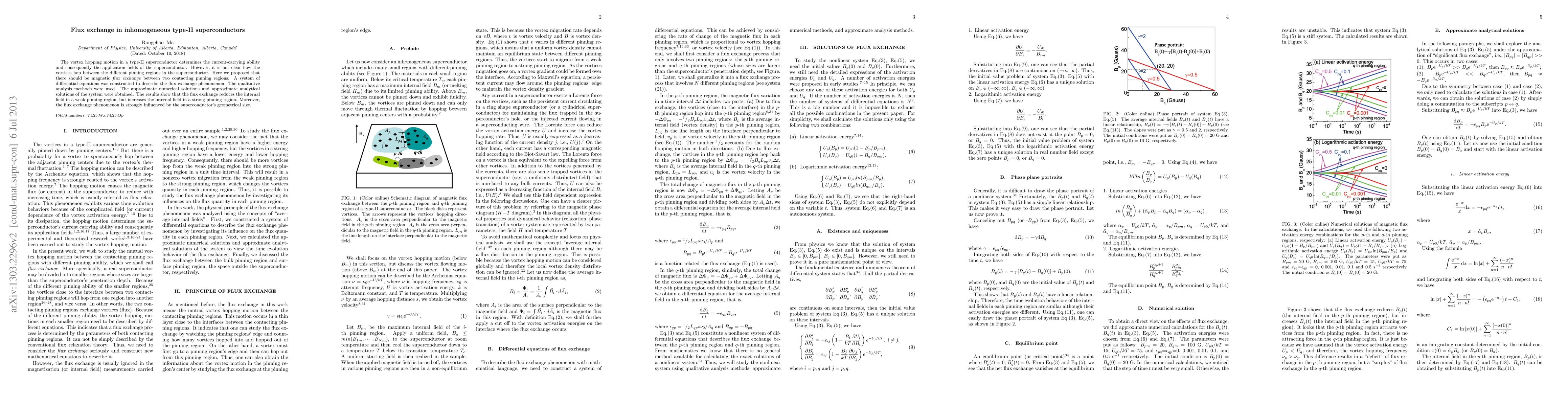 Research investigates how vortices hop between pinning regions in type-II superconductors, finding that flux exchange reduces internal field in weak pinning regions but increases it in strong pinning regions, with geometrical size significantly influencing the phenomenon.