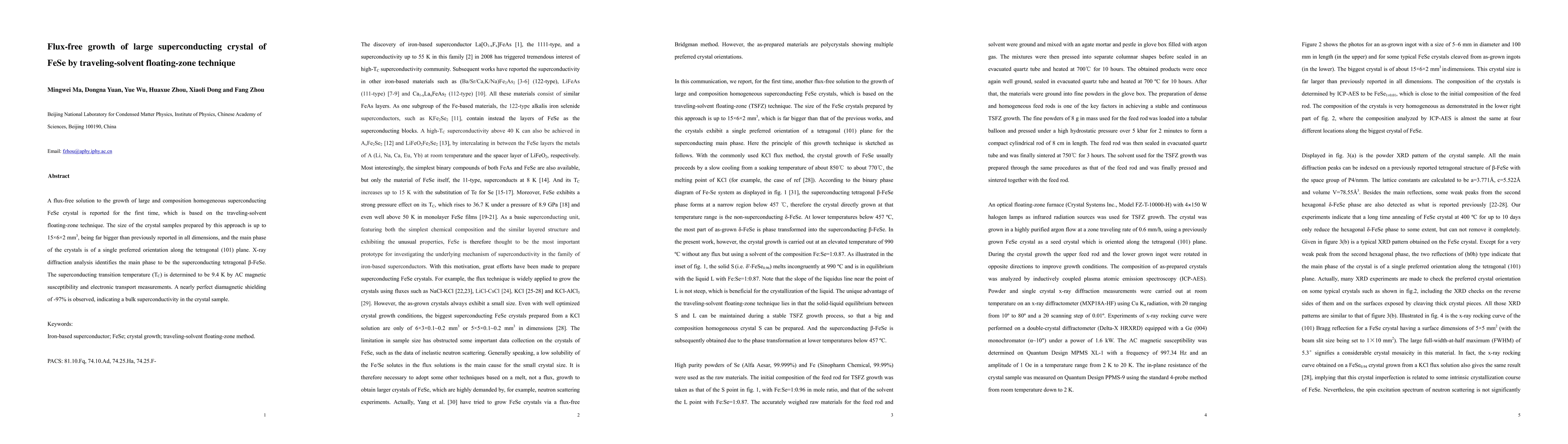 This paper reports a novel flux-free method for growing large, compositionally homogeneous superconducting FeSe crystals using the traveling-solvent floating-zone technique, achieving sizes up to 15x6x2 mm³. The crystals exhibit bulk superconductivity with a transition temperature of 9.4 K and nearly perfect diamagnetic shielding.