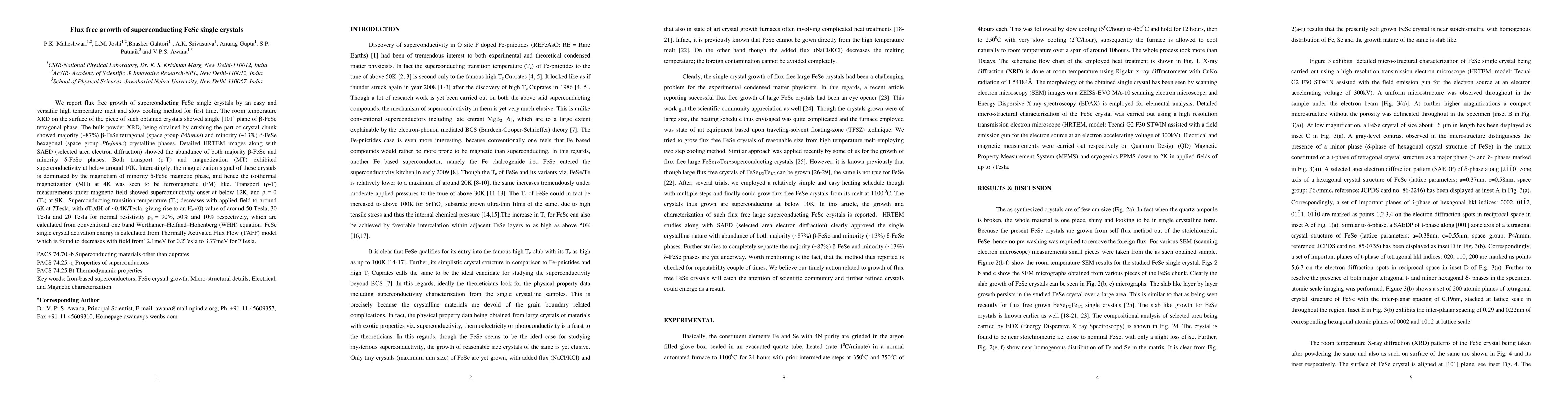 We report flux free growth of superconducting FeSe single crystals by an easy and versatile high temperature melt and slow cooling method for first time. The room temperature XRD on the surface of the piece of such obtained crystals showed single 101 plane of Beta-FeSe tetragonal phase. The bulk powder XRD, being obtained by crushing the part of crystal chunk showed majority tetragonal and minority FeSe hexagonal crystalline phases. Detailed HRTEM images along with SAED (selected area electron diffraction) showed the abundance of both majority and minority FeSe phases. Both transport (RT) and magnetization (MT) exhibited superconductivity at below around 10K. Interestingly, the magnetization signal of these crystals is dominated by the magnetism of minority magnetic phase, and hence the isothermal magnetization (MH) at 4K was seen to be ferromagnetic (FM) like. Transport (R-T) measurements under magnetic field showed superconductivity onset at below 12K, and R = 0 (Tc) at 9K. Superconducting transition temperature (Tc) decreases with applied field to around 6K at 7Tesla, with dTc/dH of 0.4K/Tesla, giving rise to an Hc2 value of around 50 Tesla, 30 Tesla and 20 Tesla for Rn = 90, 50 and 10 percent respectively. FeSe single crystal activation energy is calculated from Thermally Activated Flux Flow (TAFF) model which is found to decreases with field.