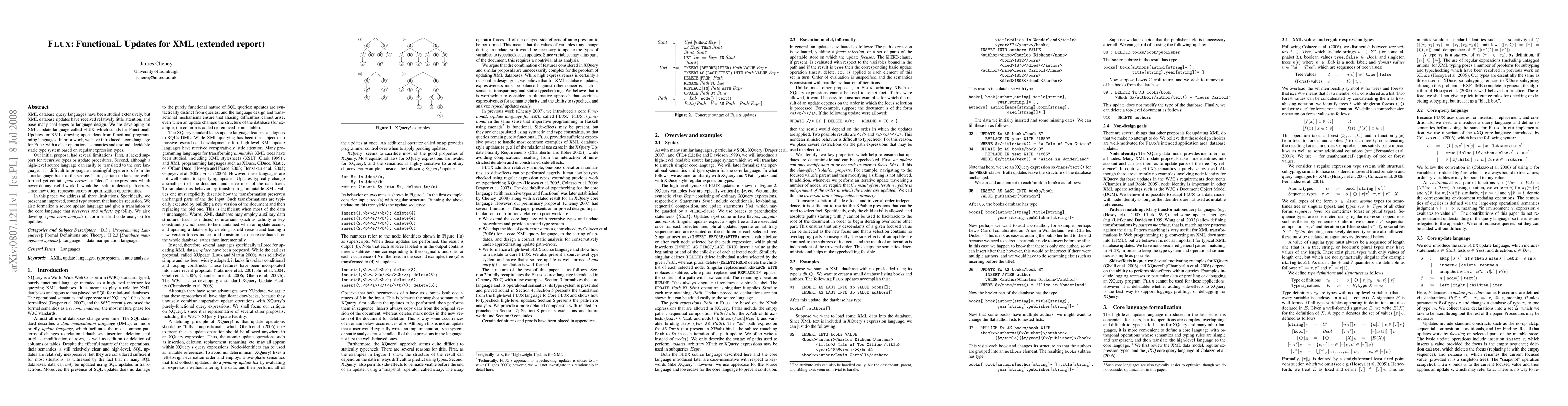 This paper introduces an enhanced XML update language called Flux, addressing prior limitations by supporting recursive types and update procedures, enabling meaningful type error propagation, and incorporating a path-error analysis to detect non-functional subexpressions. The improved type system and source update language facilitate better error detection and optimization.
