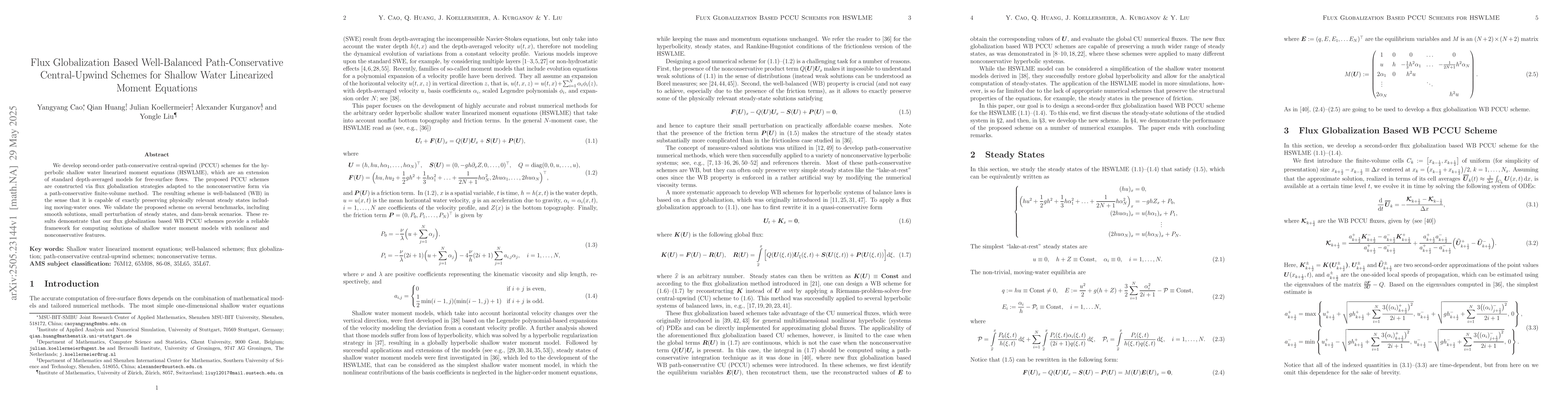 The paper develops second-order path-conservative central-upwind (PCCU) schemes for shallow water linearized moment equations (HSWLME) using flux globalization strategies adapted to nonconservative forms via a path-conservative finite-volume method.