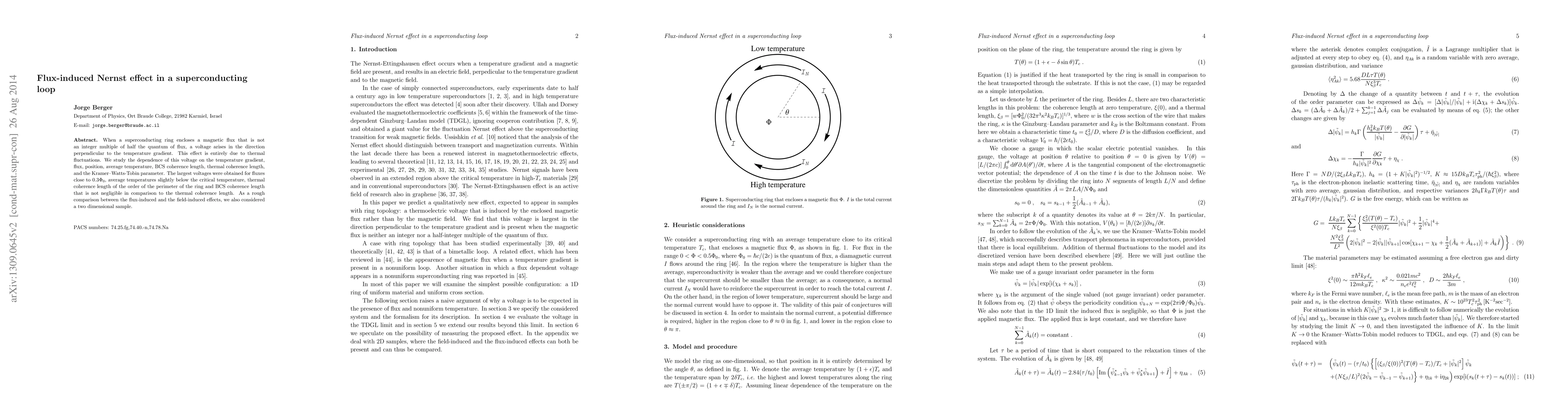 When a superconducting ring encloses a magnetic flux that is not an integer multiple of half the quantum of flux, a voltage arises in the direction perpendicular to the temperature gradient. This effect is entirely due to thermal fluctuations. We study the dependence of this voltage on the temperature gradient, flux, position, average temperature, BCS coherence length, thermal coherence length, and the Kramer--Watts-Tobin parameter. The largest voltages were obtained for fluxes close to $0.3\Phi_0$, average temperatures slightly below the critical temperature, thermal coherence length of the order of the perimeter of the ring and BCS coherence length that is not negligible in comparison to the thermal coherence length. As a rough comparison between the flux-induced and the field-induced effects, we also considered a two dimensional sample.