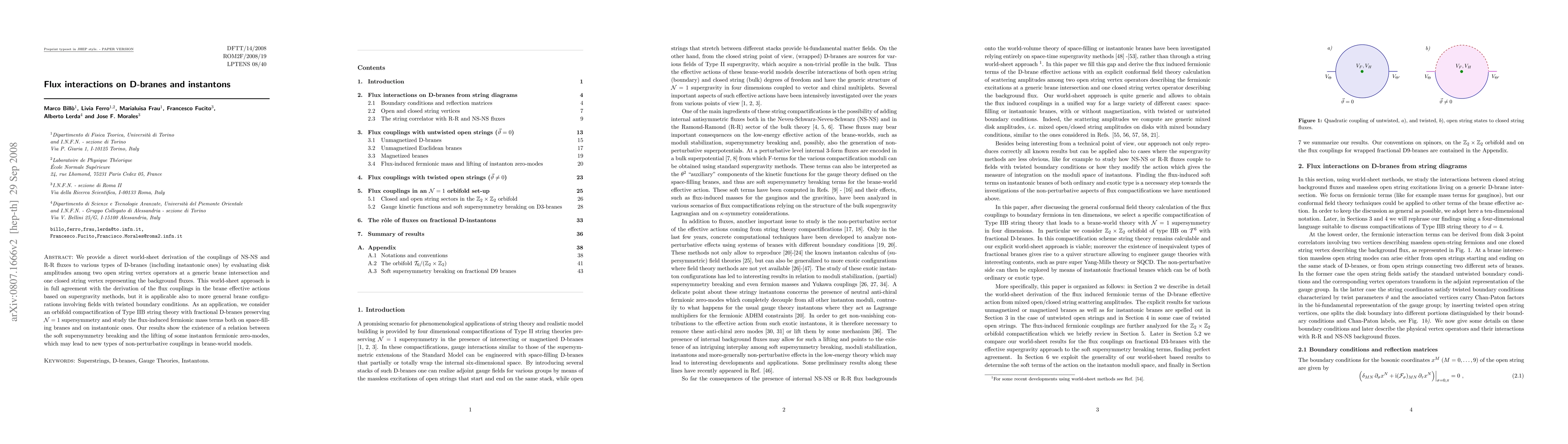 This paper derives the couplings of NS-NS and R-R fluxes to various D-branes via a world-sheet approach, showing agreement with supergravity methods and applicability to twisted boundary conditions. It investigates flux-induced fermionic mass terms in orbifold compactifications, revealing a link between soft SUSY breaking and instanton zero-modes.