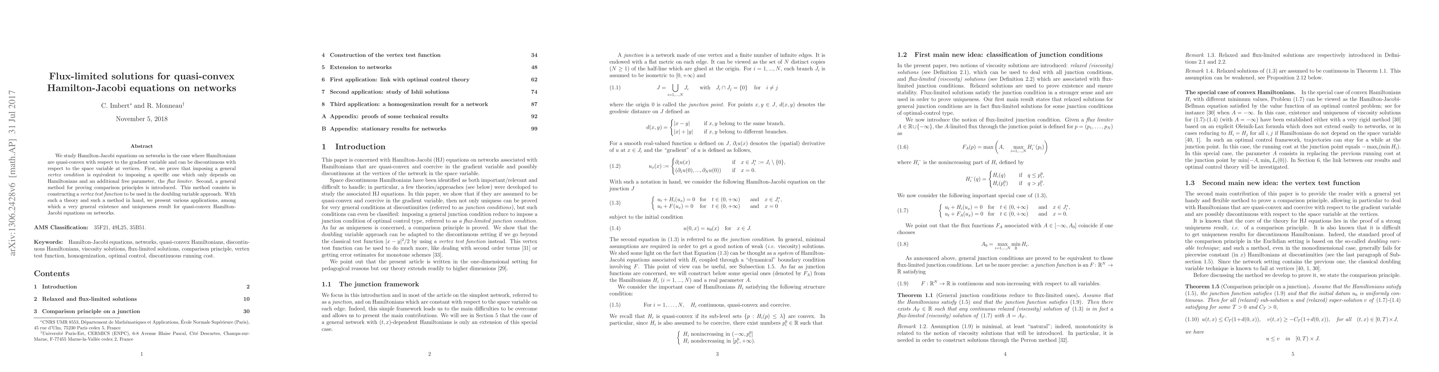 We study Hamilton-Jacobi equations on networks in the case where Hamiltonians are quasi-convex with respect to the gradient variable and can be discontinuous with respect to the space variable at vertices. First, we prove that imposing a general vertex condition is equivalent to imposing a specific one which only depends on Hamiltonians and an additional free parameter, the flux limiter. Second, a general method for proving comparison principles is introduced. This method consists in constructing a vertex test function to be used in the doubling variable approach. With such a theory and such a method in hand, we present various applications, among which a very general existence and uniqueness result for quasi-convex Hamilton-Jacobi equations on networks.