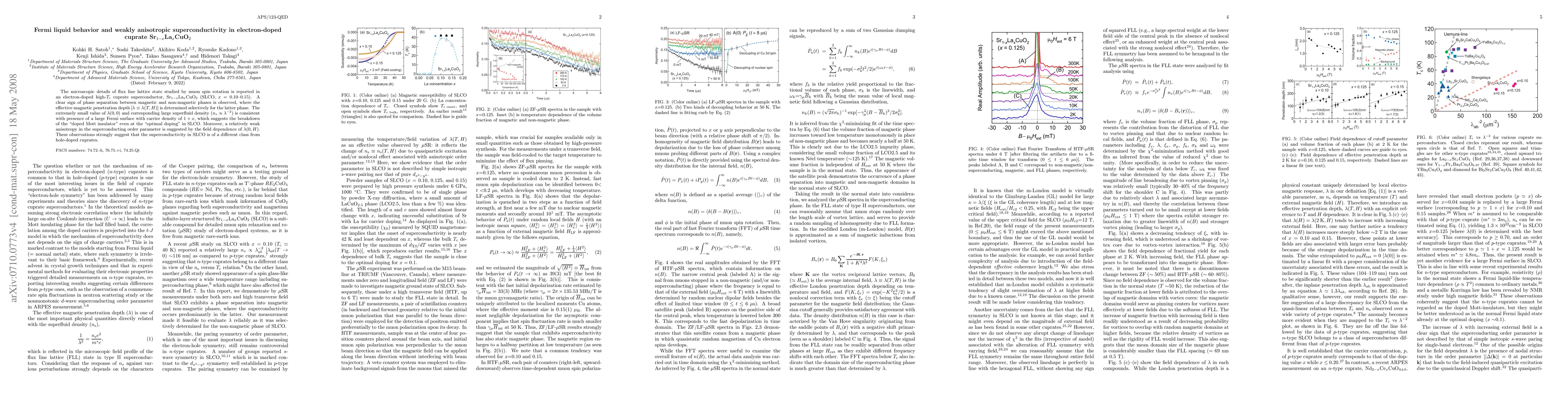 The microscopic details of flux line lattice state studied by muon spin rotation is reported in an electron-doped high-$T_{\rm c}$ cuprate superconductor, Sr$_{1-x}$La$_{x}$CuO$_{2}$ (SLCO, $x=0.10$--0.15). A clear sign of phase separation between magnetic and non-magnetic phases is observed, where the effective magnetic penetration depth [$\lambda\equiv\lambda(T,H)$] is determined selectively for the latter phase. The extremely small value of $\lambda(0,0)$ %versus $T_{\rm c}$ and corresponding large superfluid density ($n_s \propto \lambda^{-2}$) is consistent with presence of a large Fermi surface with carrier density of $1+x$, which suggests the breakdown of the "doped Mott insulator" even at the "optimal doping" in SLCO. Moreover, a relatively weak anisotropy in the superconducting order parameter is suggested by the field dependence of $\lambda(0,H)$. These observations strongly suggest that the superconductivity in SLCO is of a different class from hole-doped cuprates.