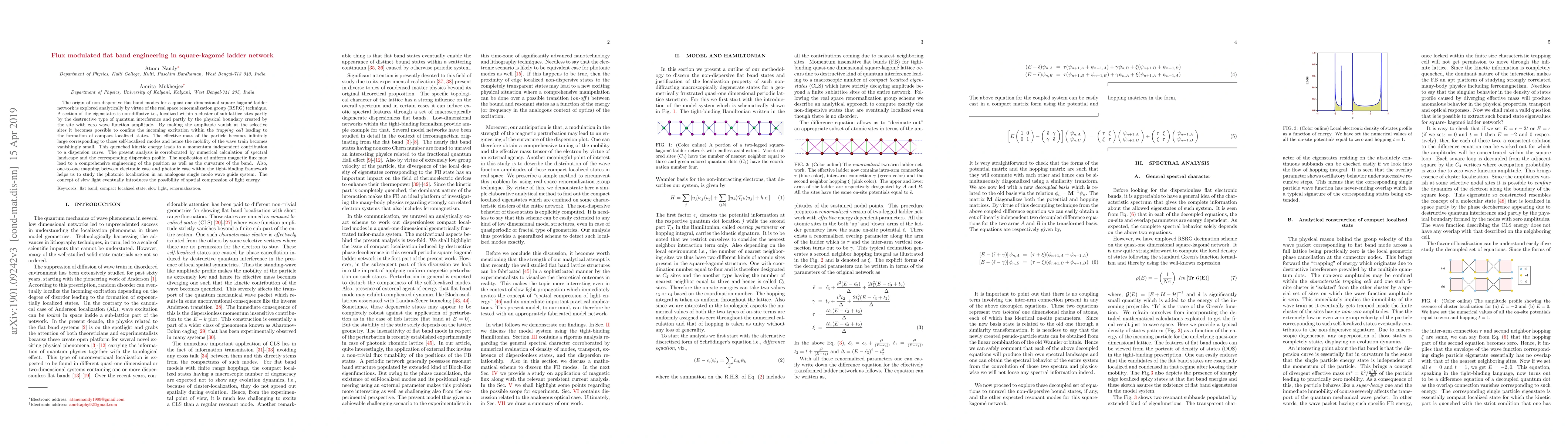 The origin of non-dispersive flat band modes for a quasi-one dimensional square-kagome ladder network is explored analytically by virtue of the real space renormalization group (RSRG) technique. A section of the eigenstates is non-diffusive i.e., localized within a cluster of sub-lattice sites partly by the destructive type of quantum interference and partly by the physical divider formed by the sites with zero wave function amplitude. By making the amplitude vanish at the selective sites it becomes possible to confine the incoming excitation within the trapping cell leading to the formation of compact localized states. The effective mass of the particle becomes infinitely large corresponding to those self-localized modes and hence the mobility of the wave train becomes vanishingly small. This quenched kinetic energy leads to a momentum independent contribution to a dispersion curve. The present analysis is corroborated by numerical calculation of spectral landscape and the corresponding dispersion profile. The application of uniform magnetic flux may lead to a comprehensive engineering of the position as well as the curvature of the band. Also, one-to-one mapping between electronic case and photonic case within the tight-binding framework helps us to study the photonic localization in an analogous single mode wave guide system. The concept of slow light eventually introduces the possibility of spatial compression of light energy.