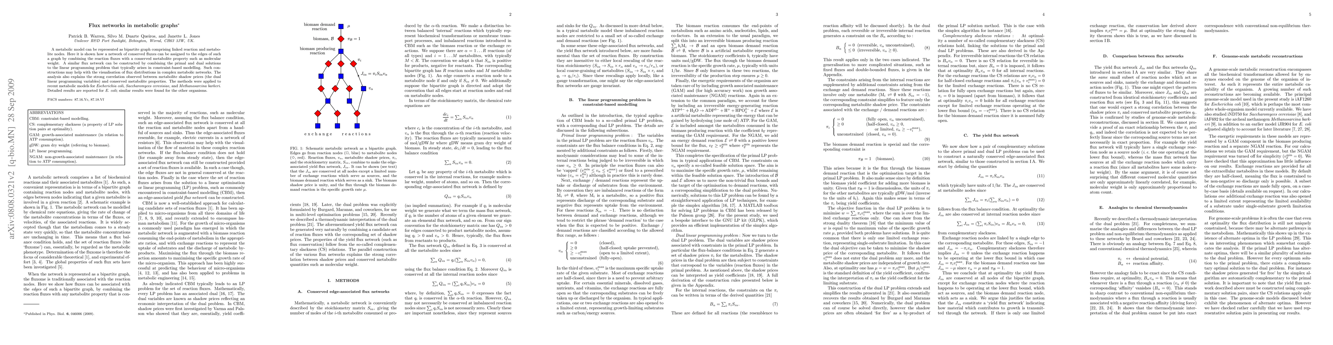 A metabolic model can be represented as bipartite graph comprising linked reaction and metabolite nodes. Here it is shown how a network of conserved fluxes can be assigned to the edges of such a graph by combining the reaction fluxes with a conserved metabolite property such as molecular weight. A similar flux network can be constructed by combining the primal and dual solutions to the linear programming problem that typically arises in constraint-based modelling. Such constructions may help with the visualisation of flux distributions in complex metabolic networks. The analysis also explains the strong correlation observed between metabolite shadow prices (the dual linear programming variables) and conserved metabolite properties. The methods were applied to recent metabolic models for Escherichia coli, Saccharomyces cerevisiae, and Methanosarcina barkeri. Detailed results are reported for E. coli; similar results were found for the other organisms.