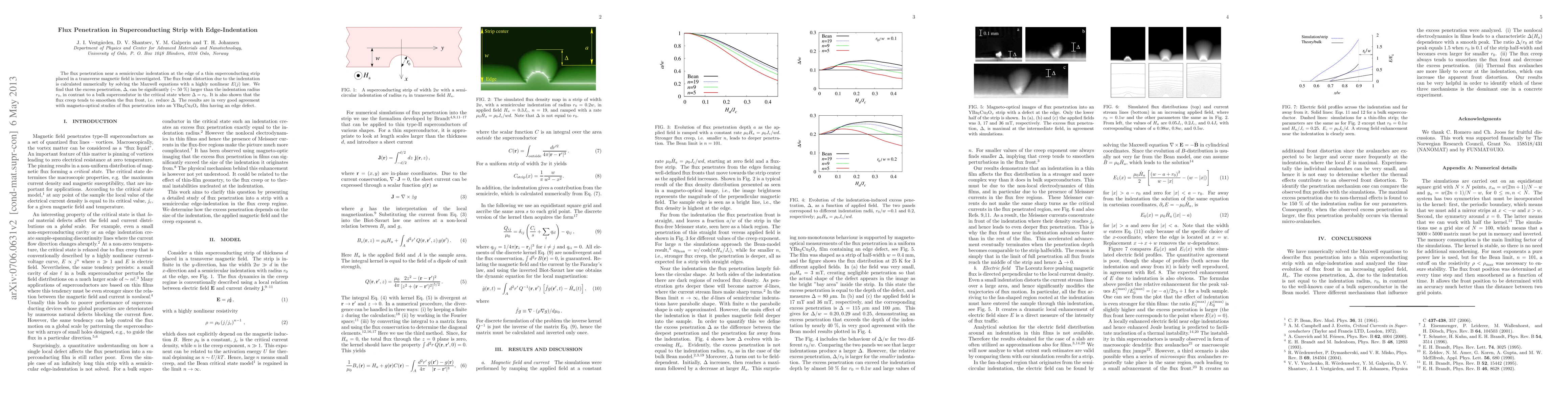 The research numerically solves Maxwell's equations to study flux penetration in a superconducting strip near an edge indentation. It finds that flux excess, Δ, can be 50% larger than indentation radius r0, contrasting with bulk critical state theory. Flux creep smoothens the flux front, reducing Δ, and results align with observations in YBa2Cu3Ox film with edge defects.