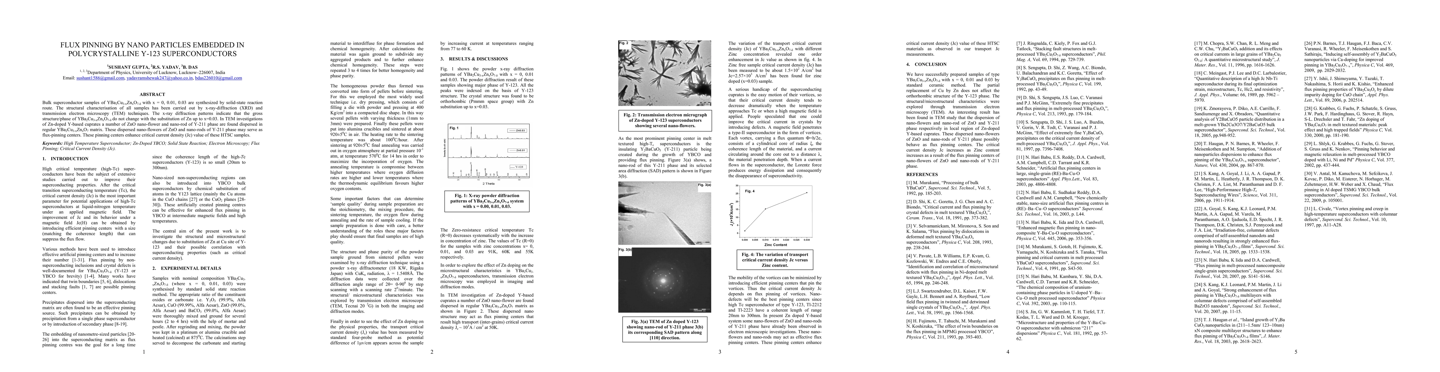 Bulk superconductor samples of YBa2Cu3-xZnxO7-{\delta} with x = 0, 0.01, 0.03 are synthesized by solid-state reaction route. The structural characterisation of all samples has been carried out by x-ray-diffraction (XRD) and transmission electron microscopy (TEM) techniques. The x-ray diffraction patterns indicate that the gross structure/phase of YBa2Cu3-xZnxO7-{\delta} do not change with the substitution of Zn up to x=0.03. In TEM investigations of Zn-doped Y-based cuprates a number of ZnO nano-flower and nano-rod of Y-211 phase are found dispersed in regular YBa2Cu3-xZnxO7 matrix. These dispersed nano-flowers of ZnO and nano-rods of Y-211 phase may serve as flux-pinning centers. These pinning centers enhance critical current density (Jc) value of these HTSC samples.