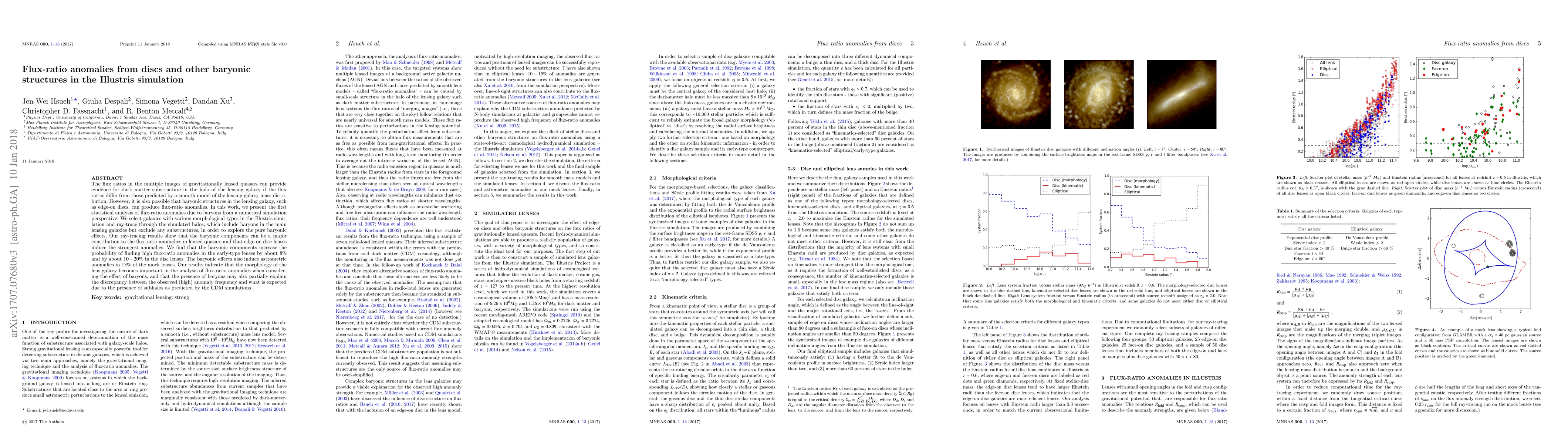 This paper investigates flux-ratio anomalies in gravitationally lensed quasars from baryonic structures in the Illustris simulation, finding that baryonic components, especially edge-on discs, significantly contribute to these anomalies, potentially explaining some discrepancies in dark matter substructure predictions.