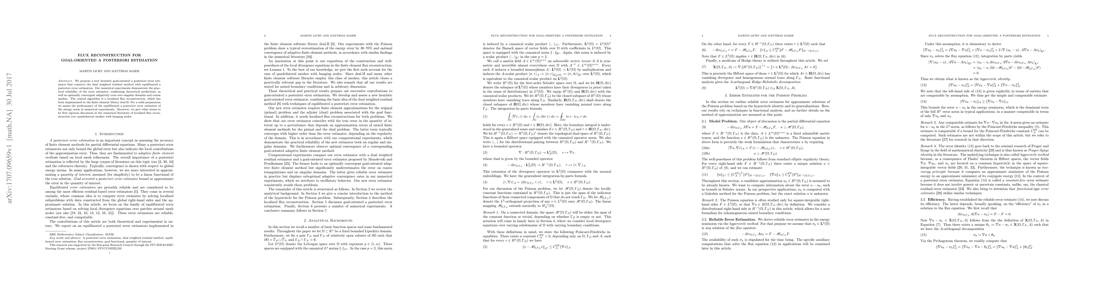 We propose a new heuristic goal-oriented a posteriori error estimator that connects the dual weighted residual method with equilibrated a posteriori error estimation. Our numerical experiments demonstrate the practical reliability of the error estimator, confirming theoretical predictions, as well as optimally convergent adaptivity even over singular domains and coarse meshes. The central algorithm is a localized flux reconstruction, which has been implemented in the finite element library deal.II. For a solid preparation we assess the performance of the equilibrated a posteriori error estimator of the energy norm in numerical experiments. Moreover, we give what seems to be first rigorous discussion in the numerical literature of localized flux reconstruction over quadrilateral meshes with hanging nodes.