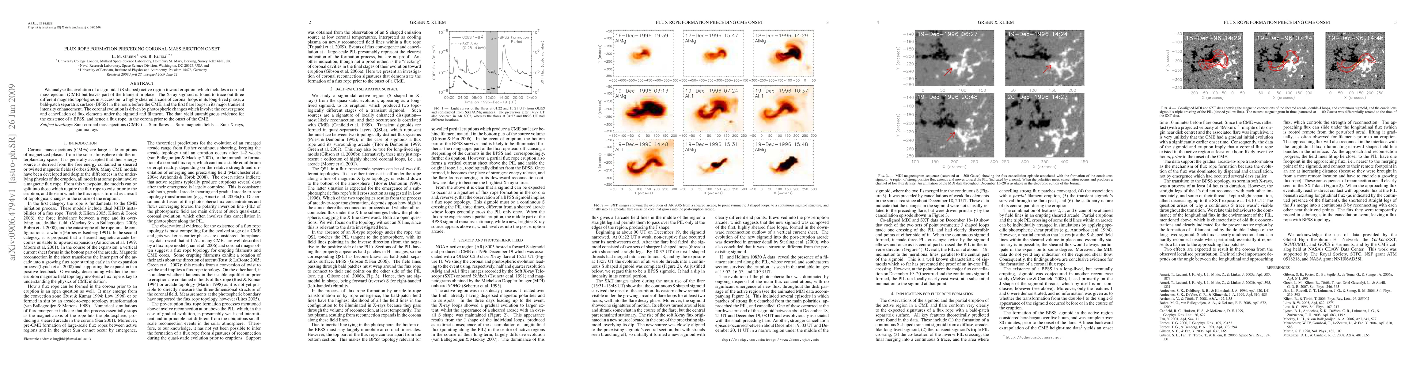We analyse the evolution of a sigmoidal (S shaped) active region toward eruption, which includes a coronal mass ejection (CME) but leaves part of the filament in place. The X-ray sigmoid is found to trace out three different magnetic topologies in succession: a highly sheared arcade of coronal loops in its long-lived phase, a bald-patch separatrix surface (BPSS) in the hours before the CME, and the first flare loops in its major transient intensity enhancement. The coronal evolution is driven by photospheric changes which involve the convergence and cancellation of flux elements under the sigmoid and filament. The data yield unambiguous evidence for the existence of a BPSS, and hence a flux rope, in the corona prior to the onset of the CME.