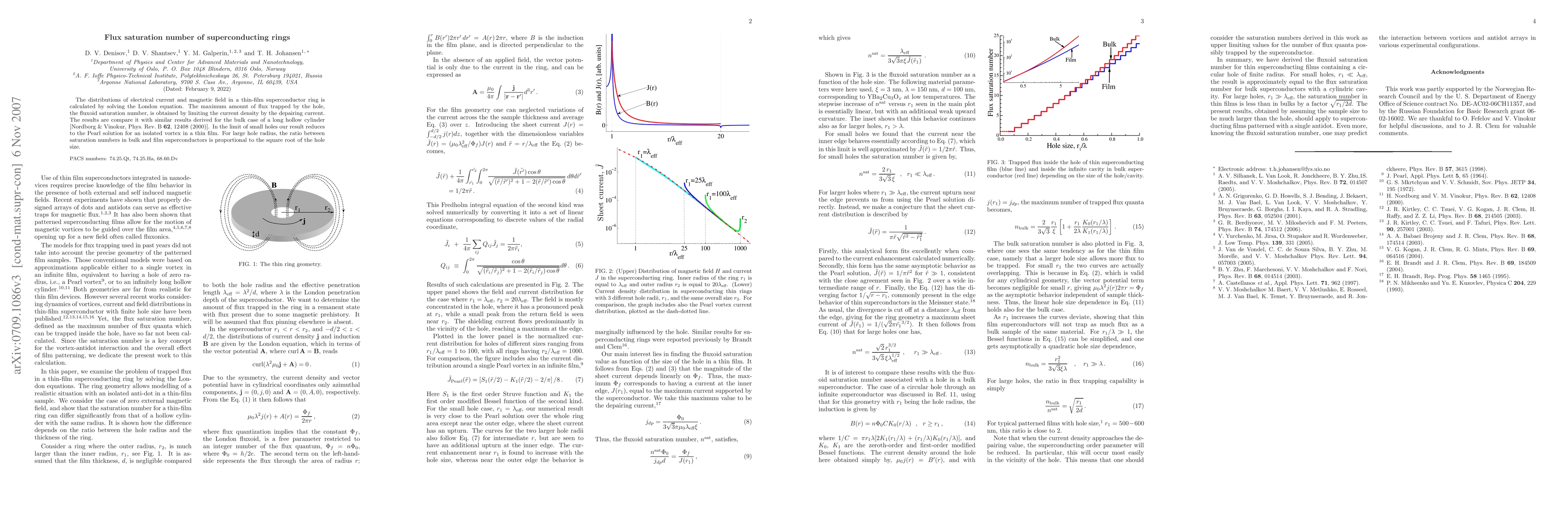 The distributions of electrical current and magnetic field in a thin-film superconductor ring is calculated by solving the London equation. The maximum amount of flux trapped by the hole, the fluxoid saturation number, is obtained by limiting the current density by the depairing current. The results are compare it with similar results derived for the bulk case of a long hollow cylinder [Nordborg & Vinokur, Phys. Rev. B 62, 12408 (2000)]. In the limit of small holes our result reduces to the Pearl solution for an isolated vortex in a thin film. For large hole radius, the ratio between saturation numbers in bulk and film superconductors is proportional to the square root of the hole size.