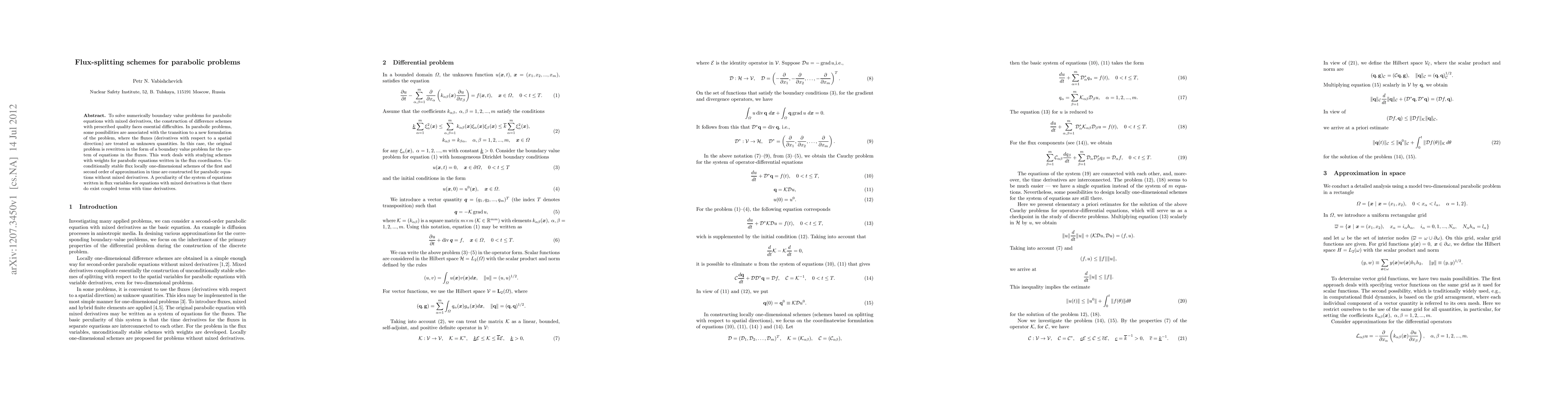 To solve numerically boundary value problems for parabolic equations with mixed derivatives, the construction of difference schemes with prescribed quality faces essential difficulties. In parabolic problems, some possibilities are associated with the transition to a new formulation of the problem, where the fluxes (derivatives with respect to a spatial direction) are treated as unknown quantities. In this case, the original problem is rewritten in the form of a boundary value problem for the system of equations in the fluxes. This work deals with studying schemes with weights for parabolic equations written in the flux coordinates. Unconditionally stable flux locally one-dimensional schemes of the first and second order of approximation in time are constructed for parabolic equations without mixed derivatives. A peculiarity of the system of equations written in flux variables for equations with mixed derivatives is that there do exist coupled terms with time derivatives.
