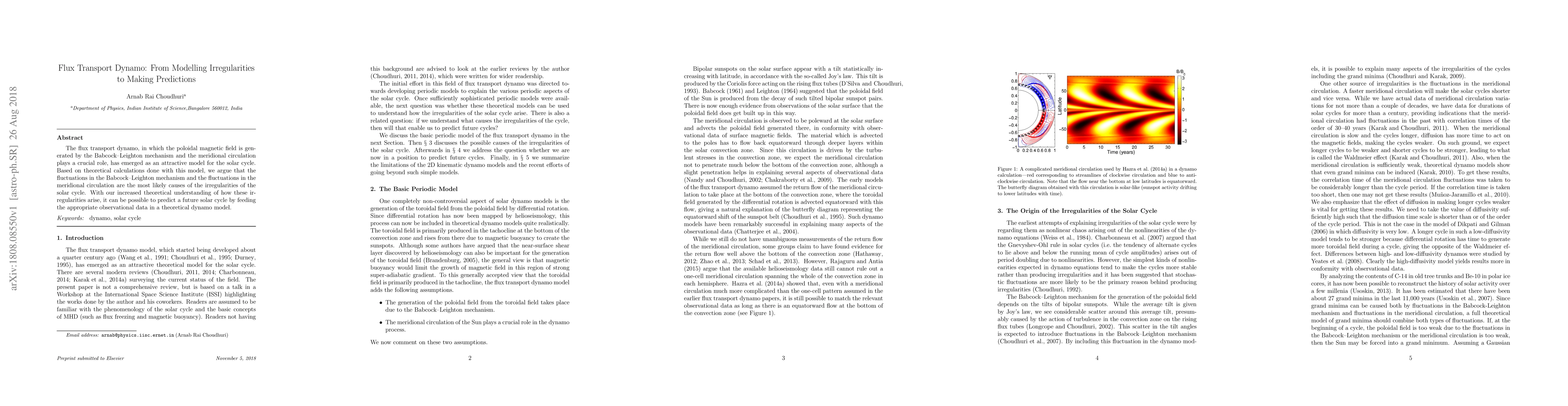 This paper explores the flux transport dynamo model for the solar cycle, identifying fluctuations in the Babcock-Leighton mechanism and meridional circulation as primary causes of solar cycle irregularities. It concludes that enhanced theoretical understanding allows for future solar cycle predictions based on observational data input.