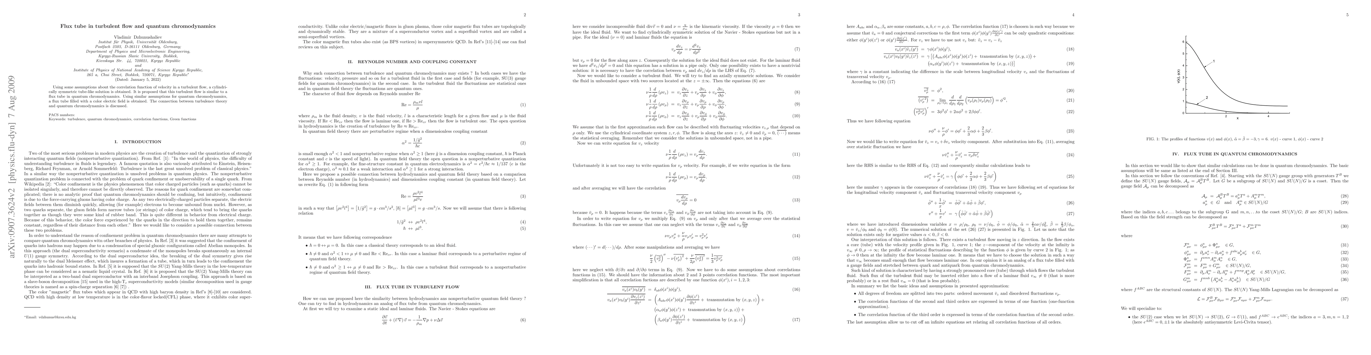 This paper explores a cylindrically symmetric tube-like solution in turbulent flow, proposing its similarity to a flux tube in quantum chromodynamics. It discusses the connection between turbulence theory and QCD by deriving a flux tube filled with a color electric field under analogous assumptions.