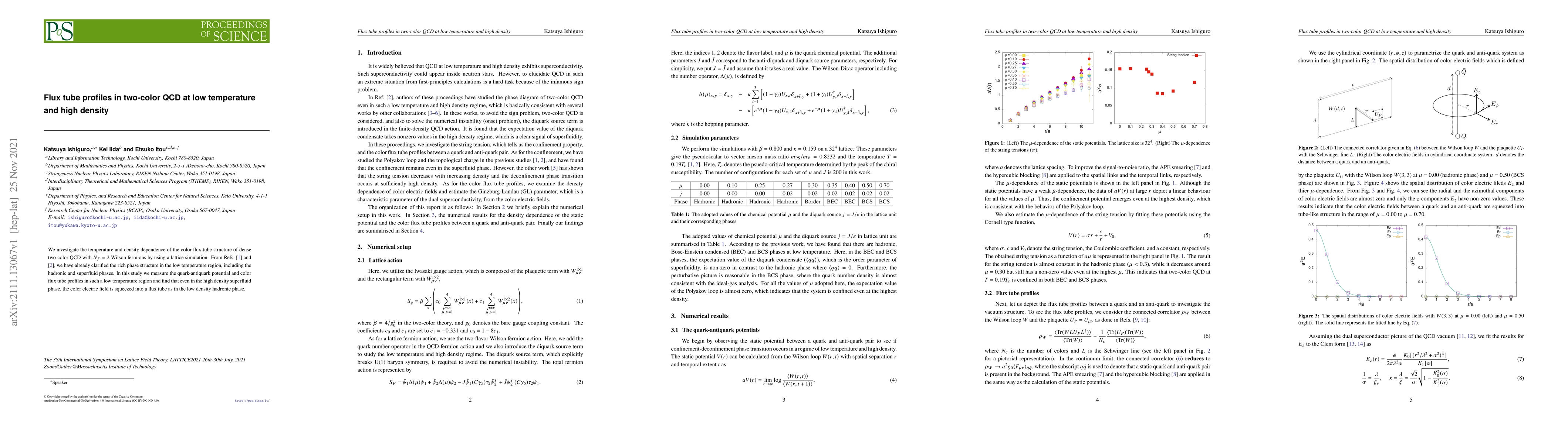 This study uses lattice simulations to examine the flux tube structure in two-color QCD at low temperatures and high densities, revealing that the color electric field forms flux tubes even in the high density superfluid phase, similar to the low density hadronic phase.